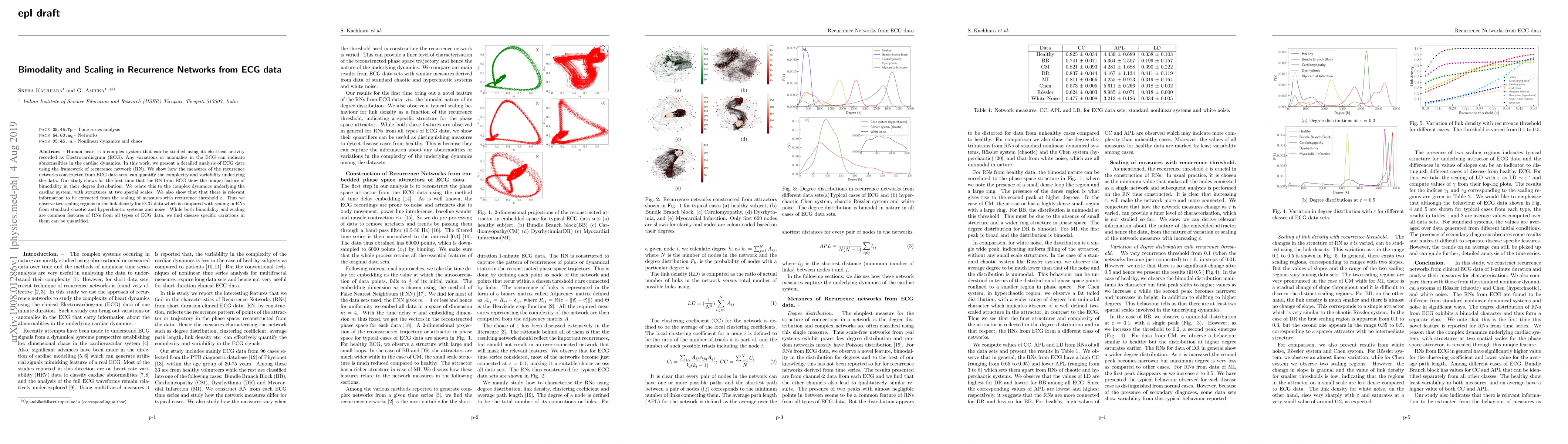 This paper analyzes ECG data using recurrence networks to quantify cardiac dynamics' complexity and variability, revealing bimodality in the degree distribution and two scaling regions in link density, indicating complex dynamics at two spatial scales and disease-specific variations.