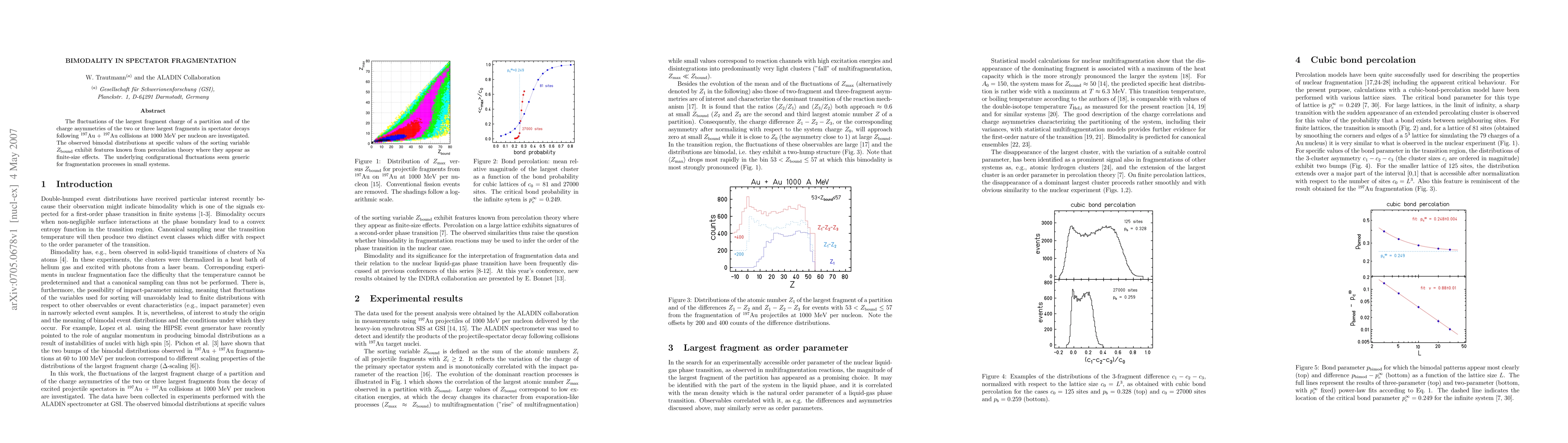 The fluctuations of the largest fragment charge of a partition and of the charge asymmetries of the two or three largest fragments in spectator decays following 197Au + 197Au collisions at 1000 MeV per nucleon are investigated. The observed bimodal distributions at specific values of the sorting variable Z_bound exhibit features known from percolation theory where they appear as finite-size effects. The underlying configurational fluctuations seem generic for fragmentation processes in small systems.