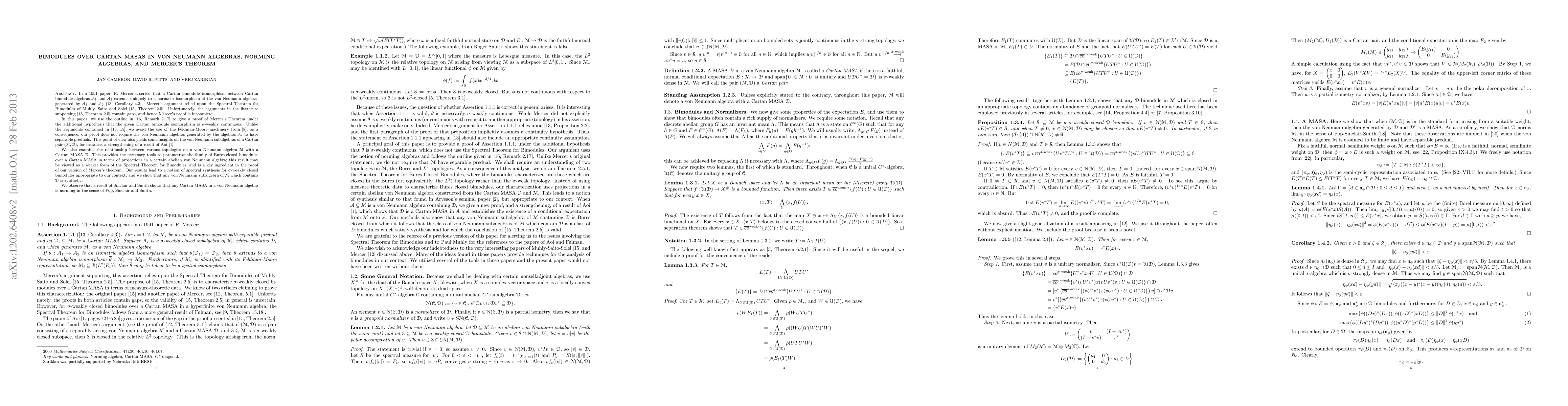 In a 1991 paper, R. Mercer asserted that a Cartan bimodule isomorphism between Cartan bimodule algebras A_1 and A_2 extends uniquely to a normal *-isomorphism of the von Neumann algebras generated by A_1 and A_2 [13, Corollary 4.3]. Mercer's argument relied upon the Spectral Theorem for Bimodules of Muhly, Saito and Solel [15, Theorem 2.5]. Unfortunately, the arguments in the literature supporting [15, Theorem 2.5] contain gaps, and hence Mercer's proof is incomplete. In this paper, we use the outline in [16, Remark 2.17] to give a proof of Mercer's Theorem under the additional hypothesis that the given Cartan bimodule isomorphism is weak-* continuous. Unlike the arguments contained in [13, 15], we avoid the use of the Feldman-Moore machinery from [8]; as a consequence, our proof does not require the von Neumann algebras generated by the algebras A_i to have separable preduals. This point of view also yields some insights on the von Neumann subalgebras of a Cartan pair (M,D), for instance, a strengthening of a result of Aoi [1]. We also examine the relationship between various topologies on a von Neumann algebra M with a Cartan MASA D. This provides the necessary tools to parametrize the family of Bures-closed bimodules over a Cartan MASA in terms of projections in a certain abelian von Neumann algebra; this result may be viewed as a weaker form of the Spectral Theorem for Bimodules, and is a key ingredient in the proof of our version of Mercer's theorem. Our results lead to a notion of spectral synthesis for weak-* closed bimodules appropriate to our context, and we show that any von Neumann subalgebra of M which contains D is synthetic. We observe that a result of Sinclair and Smith shows that any Cartan MASA in a von Neumann algebra is norming in the sense of Pop, Sinclair and Smith.