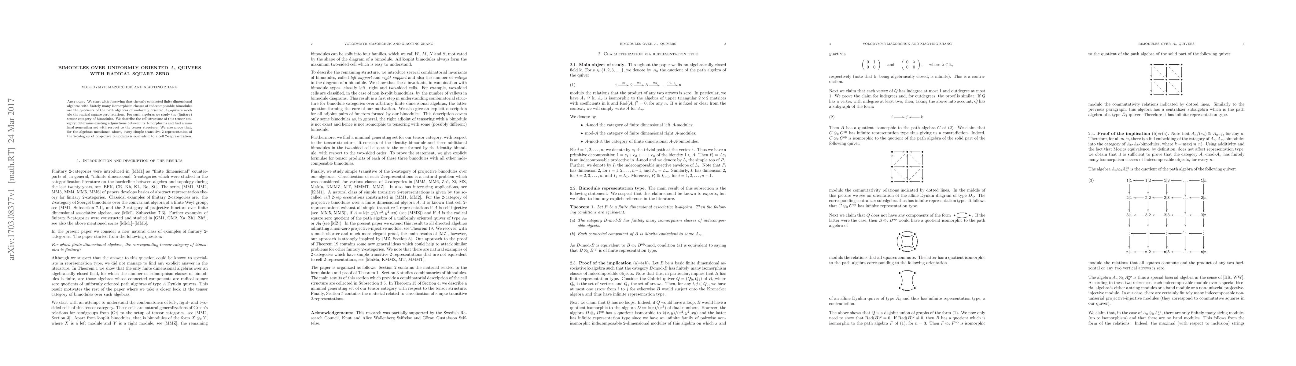 We start with observing that the only connected finite dimensional algebras with finitely many isomorphism classes of indecomposable bimodules are the quotients of the path algebras of uniformly oriented $A_n$-quivers modulo the radical square zero relations. For such algebras we study the (finitary) tensor category of bimodules. We describe the cell structure of this tensor category, determine existing adjunctions between its $1$-morphisms and find a minimal generating set with respect to the tensor structure. We also prove that, for the algebras mentioned above, every simple transitive $2$-representation of the $2$-category of projective bimodules is equivalent to a cell $2$-representation.