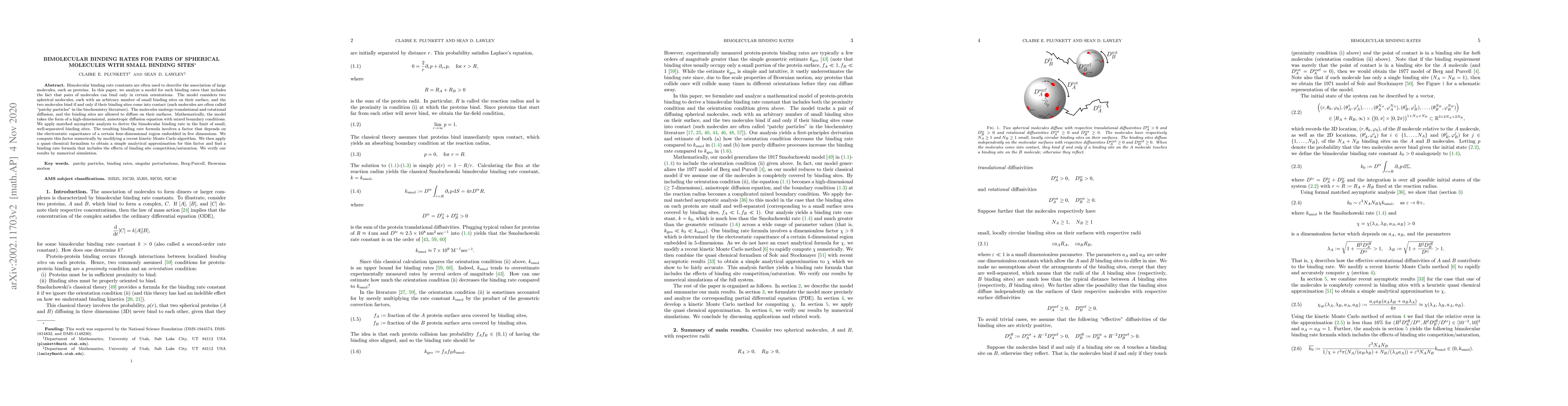 This paper develops a model for bimolecular binding rates of spherical molecules with small binding sites, considering orientation-specific binding and surface diffusion. It derives a binding rate formula involving electrostatic capacitance and validates the results through numerical simulations and a quasi chemical approximation.