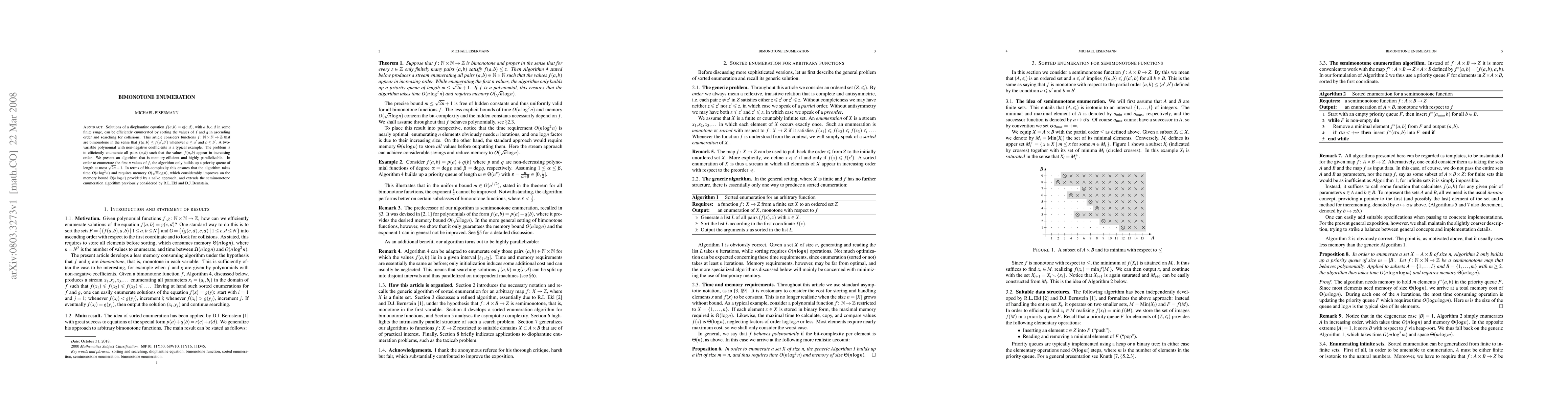 Solutions of a diophantine equation $f(a,b) = g(c,d)$, with $a,b,c,d$ in some finite range, can be efficiently enumerated by sorting the values of $f$ and $g$ in ascending order and searching for collisions. This article considers functions that are bimonotone in the sense that $f(a,b) \le f(a',b')$ whenever $a \le a'$ and $b \le b'$. A two-variable polynomial with non-negative coefficients is a typical example. The problem is to efficiently enumerate all pairs $(a,b)$ such that the values $f(a,b)$ appear in increasing order. We present an algorithm that is memory-efficient and highly parallelizable. In order to enumerate the first $n$ values of $f$, the algorithm only builds up a priority queue of length at most $\sqrt{2n}+1$. In terms of bit-complexity this ensures that the algorithm takes time $O(n \log^2 n)$ and requires memory $O(\sqrt{n} \log n)$, which considerably improves on the memory bound $\Theta(n \log n)$ provided by a naive approach, and extends the semimonotone enumeration algorithm previously considered by R.L. Ekl and D.J. Bernstein.