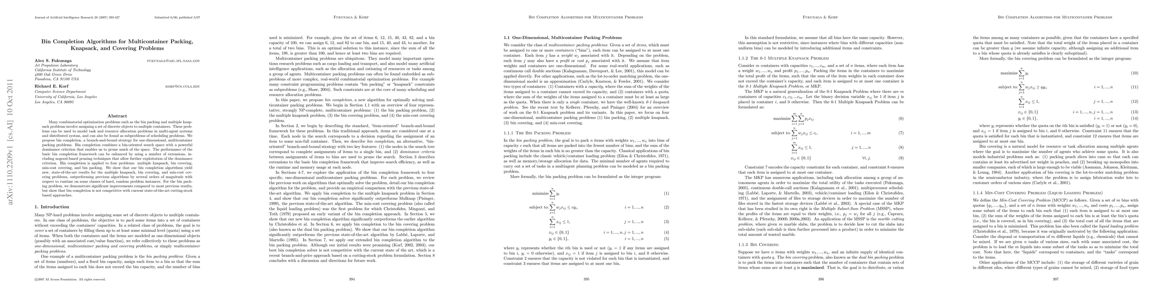 The paper proposes a bin completion strategy, a branch-and-bound method for solving one-dimensional multicontainer packing problems, which effectively prunes the search space and achieves state-of-the-art results for multiple knapsack, bin covering, and min-cost covering problems, while showing competitive but not superior results for bin packing compared to cutting-stock approaches.