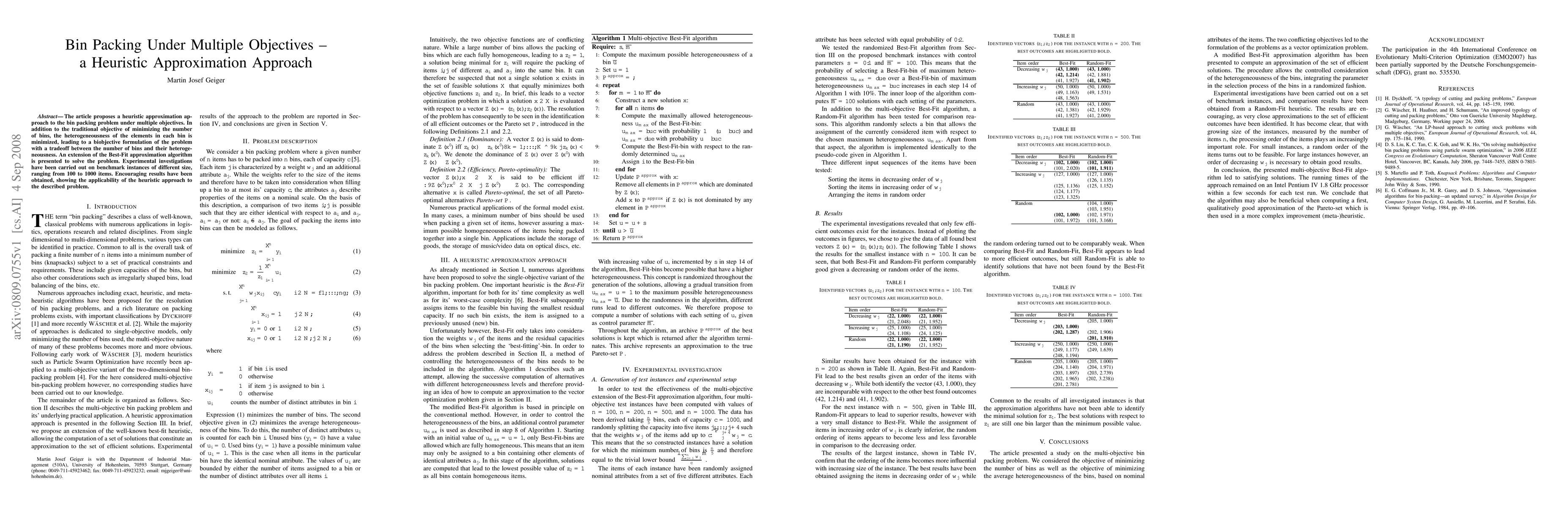 The article proposes a heuristic approximation approach to the bin packing problem under multiple objectives. In addition to the traditional objective of minimizing the number of bins, the heterogeneousness of the elements in each bin is minimized, leading to a biobjective formulation of the problem with a tradeoff between the number of bins and their heterogeneousness. An extension of the Best-Fit approximation algorithm is presented to solve the problem. Experimental investigations have been carried out on benchmark instances of different size, ranging from 100 to 1000 items. Encouraging results have been obtained, showing the applicability of the heuristic approach to the described problem.