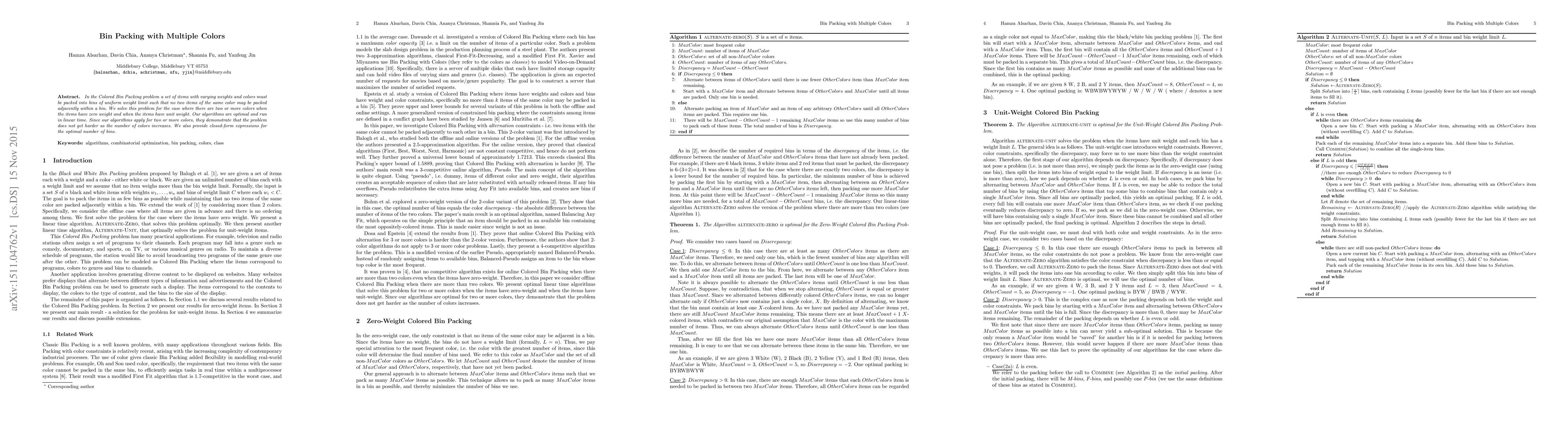 This research presents linear-time, optimal algorithms for the Colored Bin Packing problem with two or more colors, for both zero-weight and unit-weight items. It also provides closed-form expressions for the optimal number of bins, demonstrating that increasing colors doesn't make the problem harder.