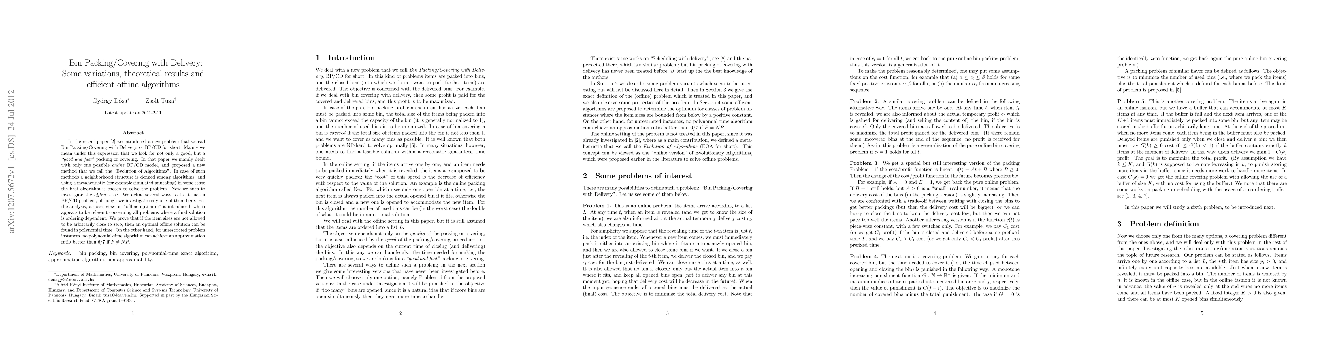 This paper investigates Bin Packing/Covering with Delivery, a problem that involves packing items into bins while minimizing the total number of deliveries. The authors prove that an optimal offline solution can be found in polynomial time for certain problem instances, but no algorithm can achieve better than a 6/7 approximation ratio for unrestricted instances.