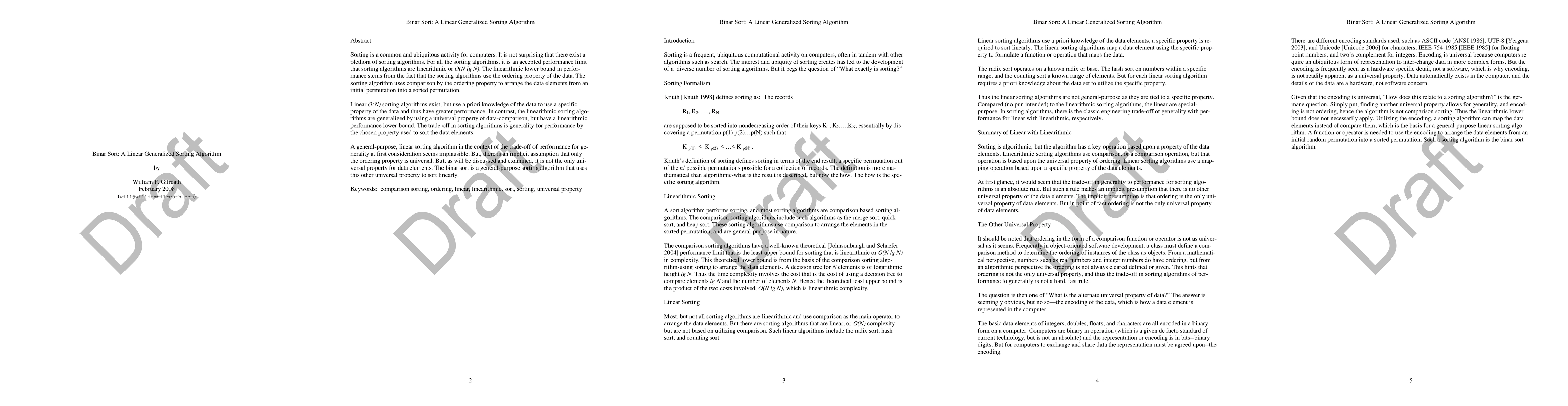 Sorting is a common and ubiquitous activity for computers. It is not surprising that there exist a plethora of sorting algorithms. For all the sorting algorithms, it is an accepted performance limit that sorting algorithms are linearithmic or O(N lg N). The linearithmic lower bound in performance stems from the fact that the sorting algorithms use the ordering property of the data. The sorting algorithm uses comparison by the ordering property to arrange the data elements from an initial permutation into a sorted permutation. Linear O(N) sorting algorithms exist, but use a priori knowledge of the data to use a specific property of the data and thus have greater performance. In contrast, the linearithmic sorting algorithms are generalized by using a universal property of data-comparison, but have a linearithmic performance lower bound. The trade-off in sorting algorithms is generality for performance by the chosen property used to sort the data elements. A general-purpose, linear sorting algorithm in the context of the trade-off of performance for generality at first consideration seems implausible. But, there is an implicit assumption that only the ordering property is universal. But, as will be discussed and examined, it is not the only universal property for data elements. The binar sort is a general-purpose sorting algorithm that uses this other universal property to sort linearly.