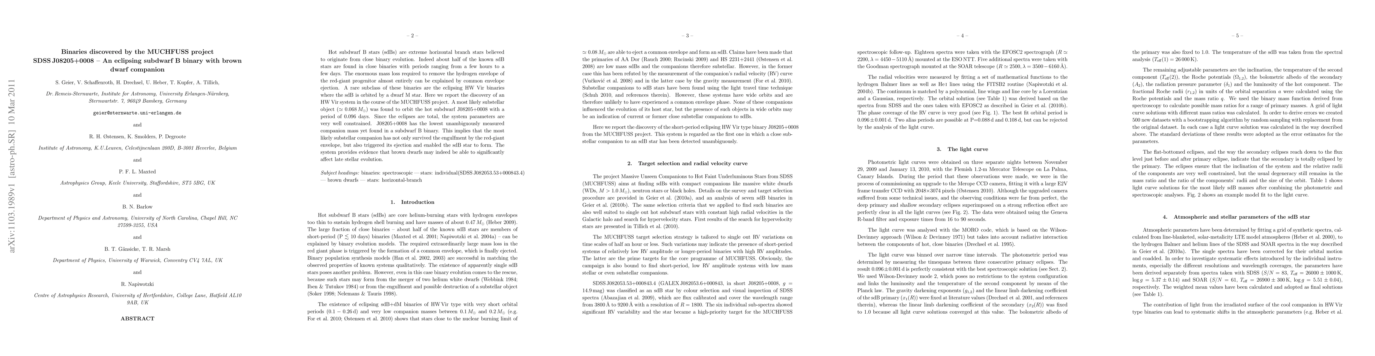 The MUCHFUSS project discovered SDSS J08205+0008, an eclipsing subdwarf B binary with a brown dwarf companion. This rare HW Vir system features a substellar object with a mass of approximately 0.068 solar masses, suggesting it influenced the red-giant progenitor's common envelope ejection, providing evidence that brown dwarfs can significantly impact late stellar evolution.
