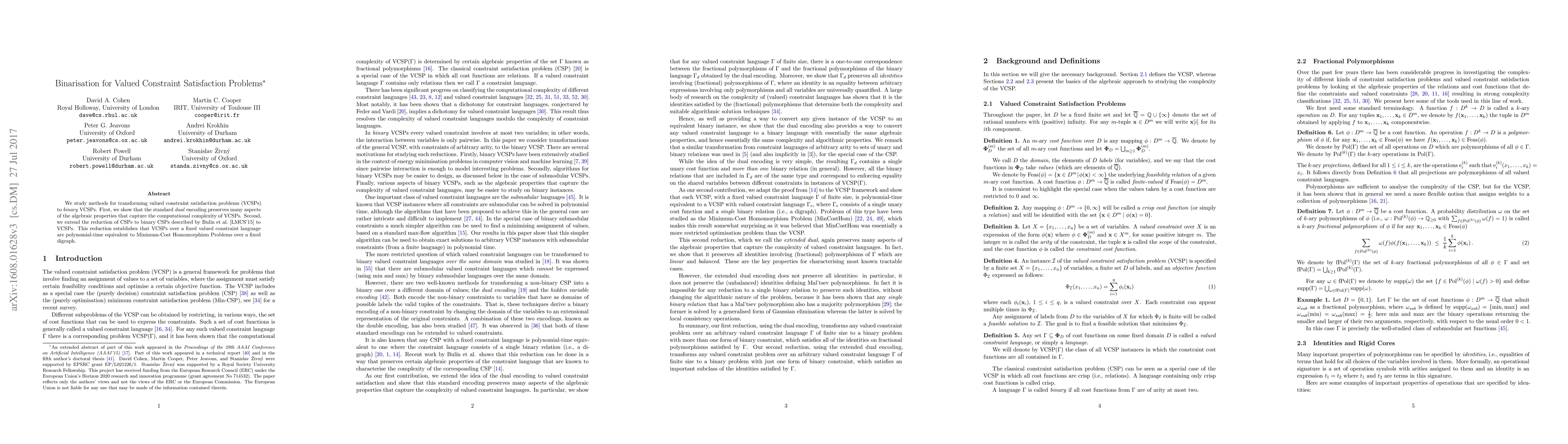 This paper explores methods to transform valued constraint satisfaction problems (VCSPs) into binary VCSPs, demonstrating that dual encoding maintains key algebraic properties. It extends a CSP reduction to VCSPs, showing they are polynomial-time equivalent to Minimum-Cost Homomorphism Problems over a fixed digraph.