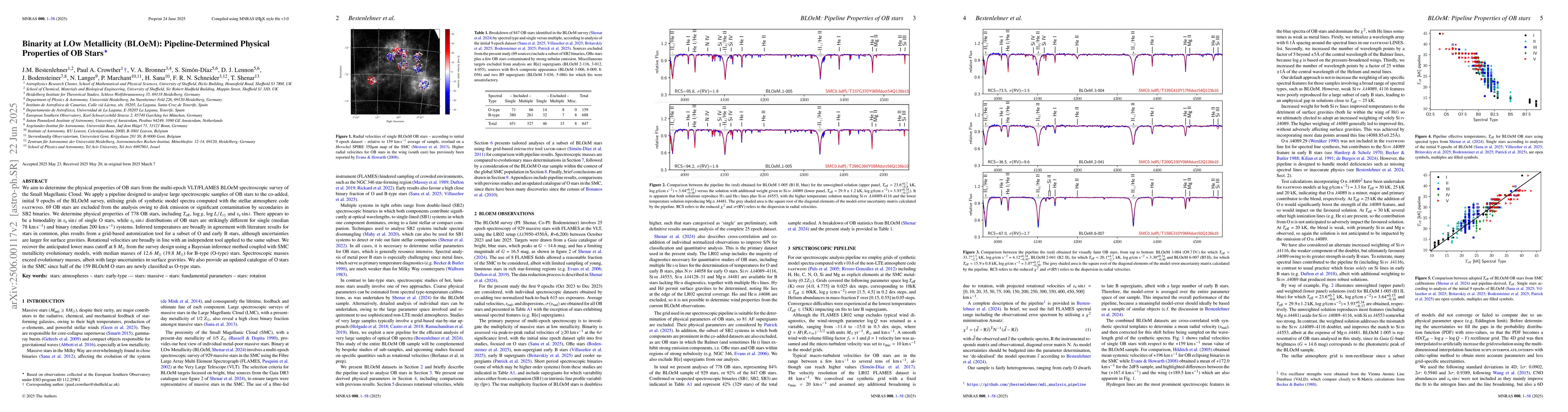 This study determines physical properties of OB stars in the Small Magellanic Cloud using a pipeline-based analysis, revealing bimodal distributions in rotational velocities and differing properties between single and binary systems.