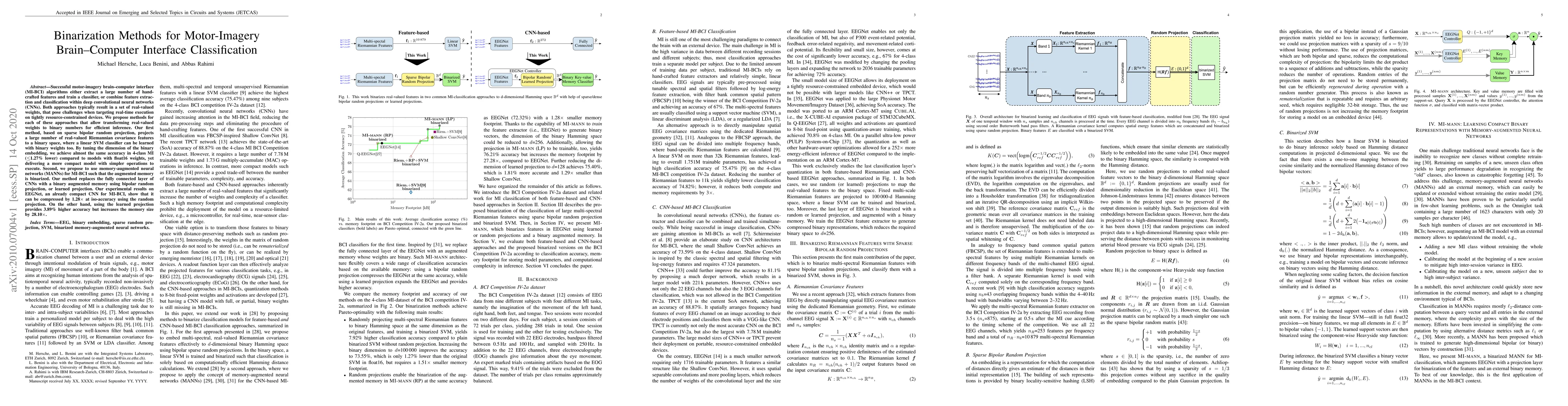 This paper proposes binarization methods for motor-imagery brain-computer interfaces (MI-BCI) to enhance real-time execution on resource-constrained devices. It introduces sparse bipolar random projection for efficient feature extraction and binary weight classifiers, achieving comparable accuracy with reduced model size. Additionally, it explores memory-augmented neural networks with binarized memory, demonstrating significant compression and accuracy trade-offs.