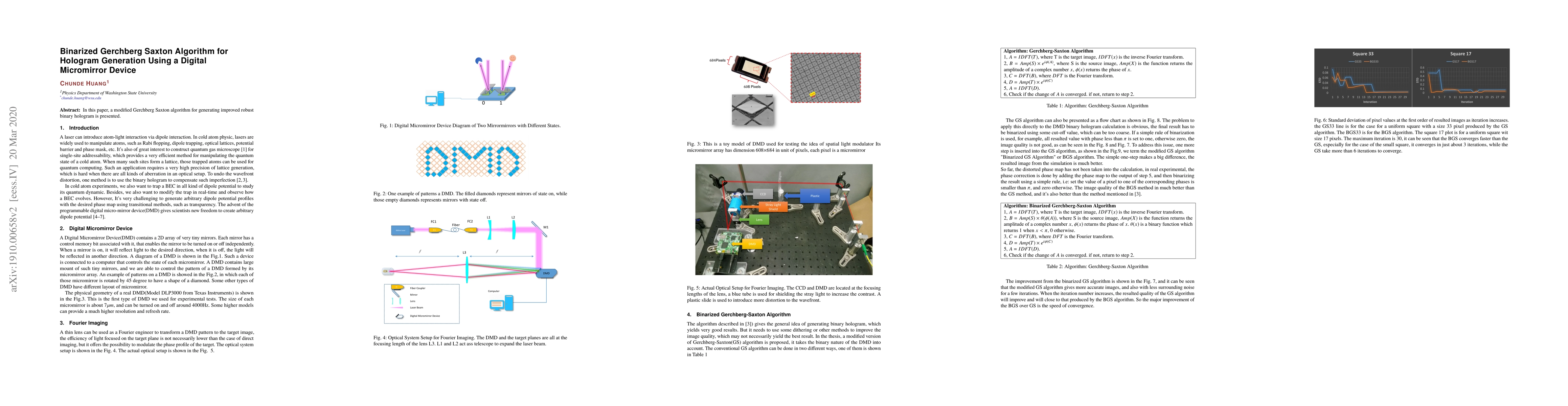 Summary: This paper introduces a binarized version of the Gerchberg Saxton algorithm to enhance the robustness of binary hologram generation, specifically utilizing a Digital Micromirror Device for improved performance.