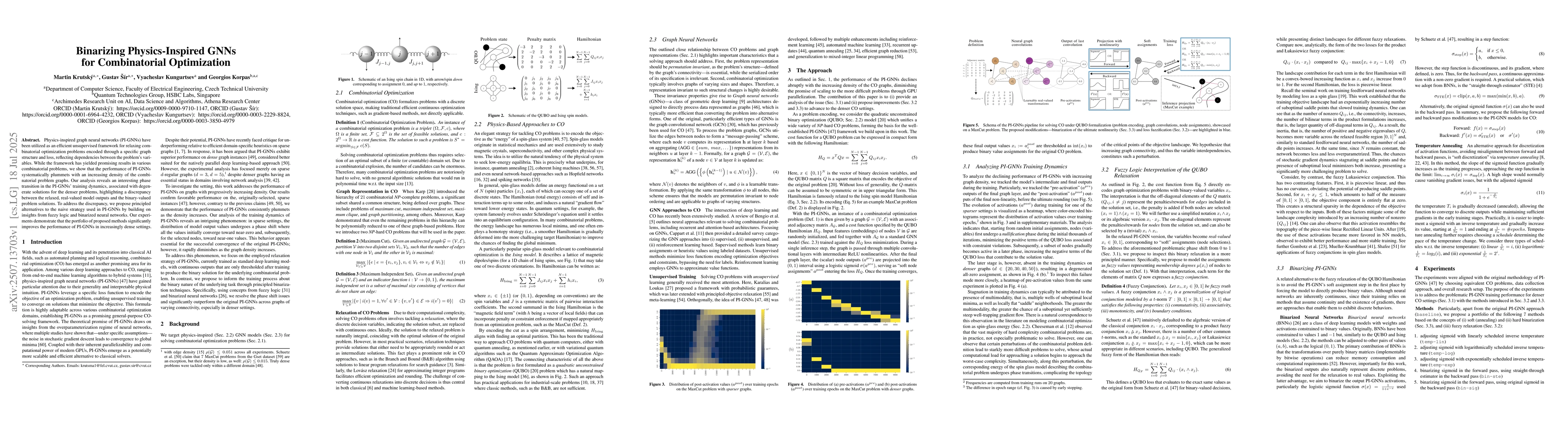 Physics-inspired graph neural networks (PI-GNNs) have been utilized as an efficient unsupervised framework for relaxing combinatorial optimization problems encoded through a specific graph structure and loss, reflecting dependencies between the problem's variables. While the framework has yielded promising results in various combinatorial problems, we show that the performance of PI-GNNs systematically plummets with an increasing density of the combinatorial problem graphs. Our analysis reveals an interesting phase transition in the PI-GNNs' training dynamics, associated with degenerate solutions for the denser problems, highlighting a discrepancy between the relaxed, real-valued model outputs and the binary-valued problem solutions. To address the discrepancy, we propose principled alternatives to the naive strategy used in PI-GNNs by building on insights from fuzzy logic and binarized neural networks. Our experiments demonstrate that the portfolio of proposed methods significantly improves the performance of PI-GNNs in increasingly dense settings.