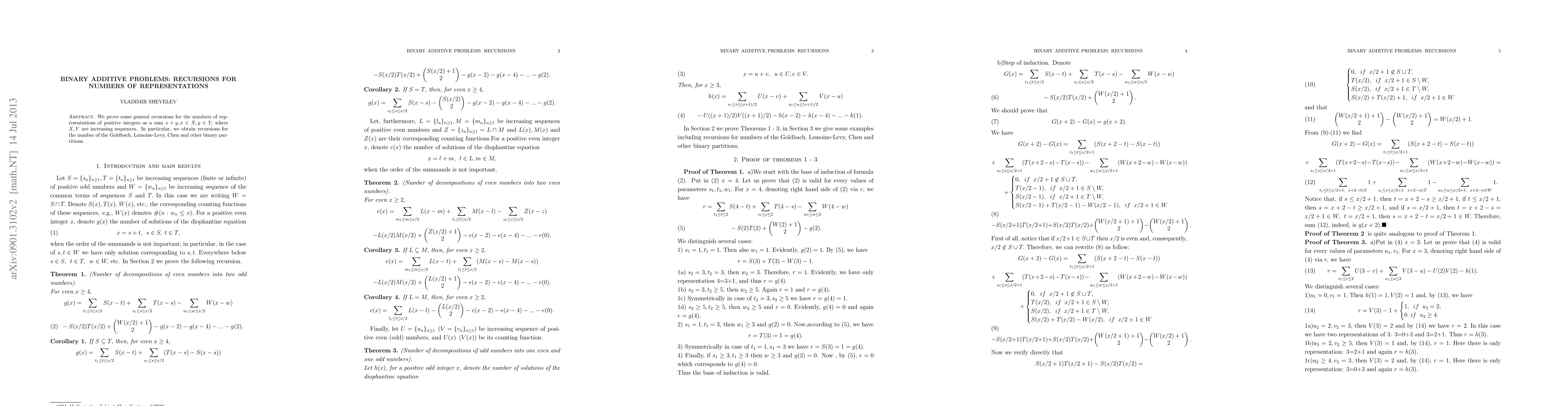 Researchers found general recursions for counting binary additive problems like Goldbach's conjecture, relating to partitions of positive integers into sums of two numbers from increasing sequences X and Y.