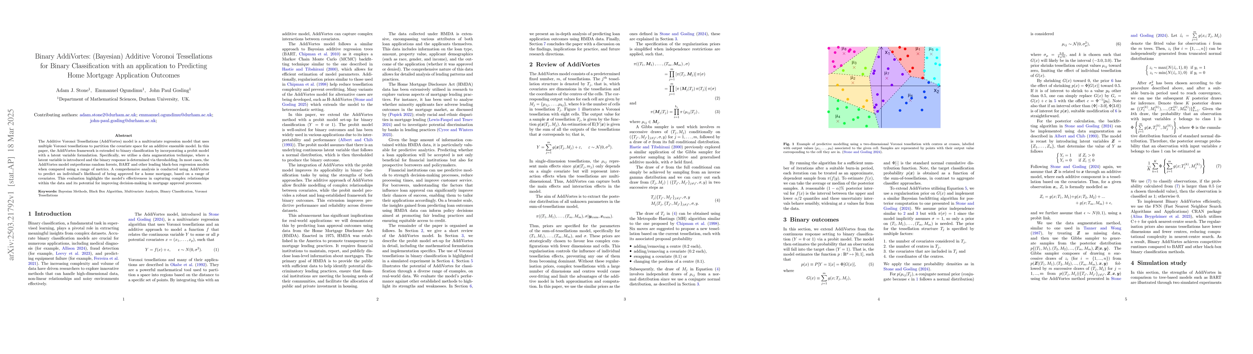 This research presents AddiVortes as a powerful and generalizable tool for predictive modeling, especially in scenarios demanding interpretability and the ability to model complex data structures. It has practical relevance in mortgage lending and other classification tasks where both accuracy and interpretability are critical.