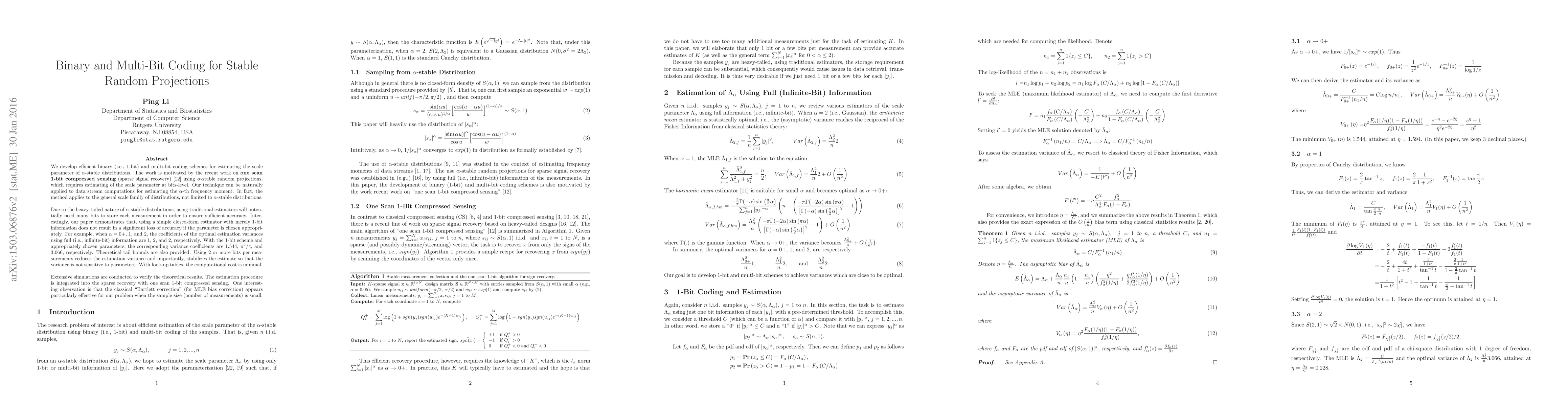 This paper proposes efficient binary and multi-bit coding schemes for estimating the scale parameter of $\alpha$-stable distributions, leveraging 1-bit compressed sensing techniques. It demonstrates that 1-bit information can maintain accuracy with appropriate parameter selection, while multi-bit coding further stabilizes estimates and reduces variance, all with minimal computational cost.