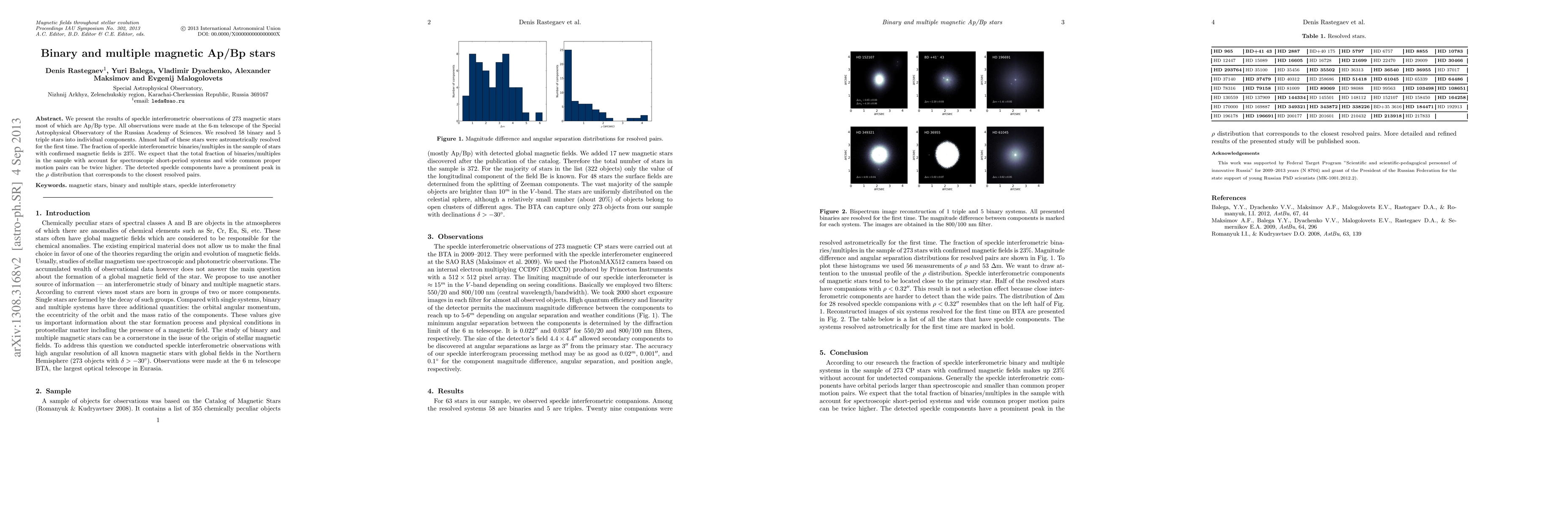 We present the results of speckle interferometric observations of 273 magnetic stars most of which are Ap/Bp type. All observations were made at the 6-m telescope of the Special Astrophysical Observatory of the Russian Academy of Sciences. We resolved 58 binary and 5 triple stars into individual components. Almost half of these stars were astrometrically resolved for the first time. The fraction of speckle interferometric binaries/multiples in the sample of stars with confirmed magnetic fields is 23%. We expect that the total fraction of binaries/multiples in the sample with account for spectroscopic short-period systems and wide common proper motion pairs can be twice higher. The detected speckle components have a prominent peak in the {\rho} distribution that corresponds to the closest resolved pairs.