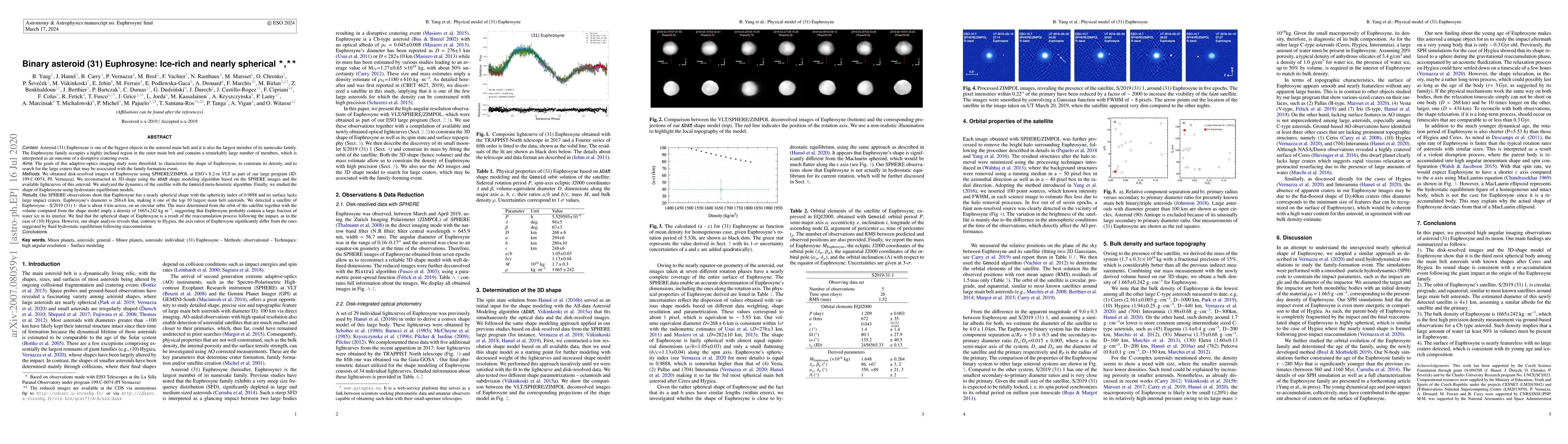 Asteroid (31) Euphrosyne is one of the biggest objects in the asteroid main belt and the Euphrosyne family occupies a highly inclined region in the outer main belt and contains a remarkably large number of members, which is interpreted as an outcome of a disruptive cratering event. The goals of this adaptive-optics imaging study were threefold: to characterize the shape of Euphrosyne, to constrain its density, and to search for the large craters that may be associated with the family formation event. We obtained disk-resolved images of Euphrosyne using SPHERE/ZIMPOL at ESO's 8.2-m VLT as part of our large program (ID: 199.C-0074, PI: Vernazza). We reconstructed its 3D-shape using the adam shape modeling algorithm based on the SPHERE images and the available lightcurves of this asteroid. We analyzed the dynamics of the satellite with the genoid meta-heuristic algorithm. Finally, we studied the shape of Euphrosyne using hydrostatic equilibrium models. Our SPHERE observations show that Euphrosyne has a nearly spherical shape with the sphericity index of 0.9888 and its surface lacks large impact craters. Euphrosyne's diameter is 268+/-6 km, making it one of the top 10 largest main belt asteroids. We detected a satellite of Euphrosyne -- S/2019 (31) 1-- that is about 4 km across, on an circular orbit. The mass determined from the orbit of the satellite together with the volume computed from the shape model imply a density of 1665+/-242 kg/m^3, suggesting that Euphrosyne probably contain a large fraction of water ice in its interior. We find that the spherical shape of Euphrosyne is a result of the reaccumulation process following the impact, as in the case of (10) Hygiea. However, our shape analysis reveals that, contrary to Hygiea, the axis ratios of Euphrosyne significantly differ from the ones suggested by fluid hydrostatic equilibrium following reaccumulation.