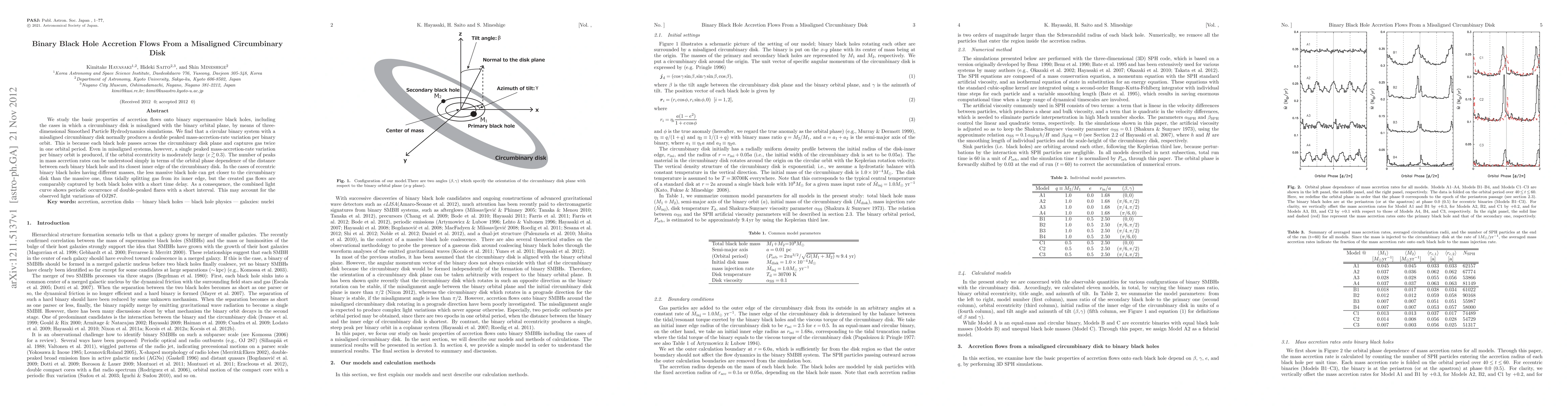 We study the basic properties of accretion flows onto binary supermassive black holes, including the cases in which a circumbinary disk is misaligned with the binary orbital plane, by means of three-dimensional Smoothed Particle Hydrodynamics simulations. We find that a circular binary system with a misaligned circumbinary disk normally produces a double peaked mass-accretion-rate variation per binary orbit. This is because each black hole passes across the circumbinary disk plane and captures gas twice in one orbital period. Even in misaligned systems, however, a single peaked mass-accretion-rate variation per binary orbit is produced, if the orbital eccentricity is moderately large (e\lesssim0.3). The number of peaks in mass accretion rates can be understood simply in terms of the orbital phase dependence of the distance between each binary black hole and its closest inner edge of the circumbinary disk. In the cases of eccentric binary black holes having different masses, the less massive black hole can get closer to the circumbinary disk than the massive one, thus tidally splitting gas from its inner edge, but the created gas flows are comparably captured by both black holes with a short time delay. As a consequence, the combined light curve shows periodic occurrence of double-peaked flares with a short interval. This may account for the observed light variations of OJ287.