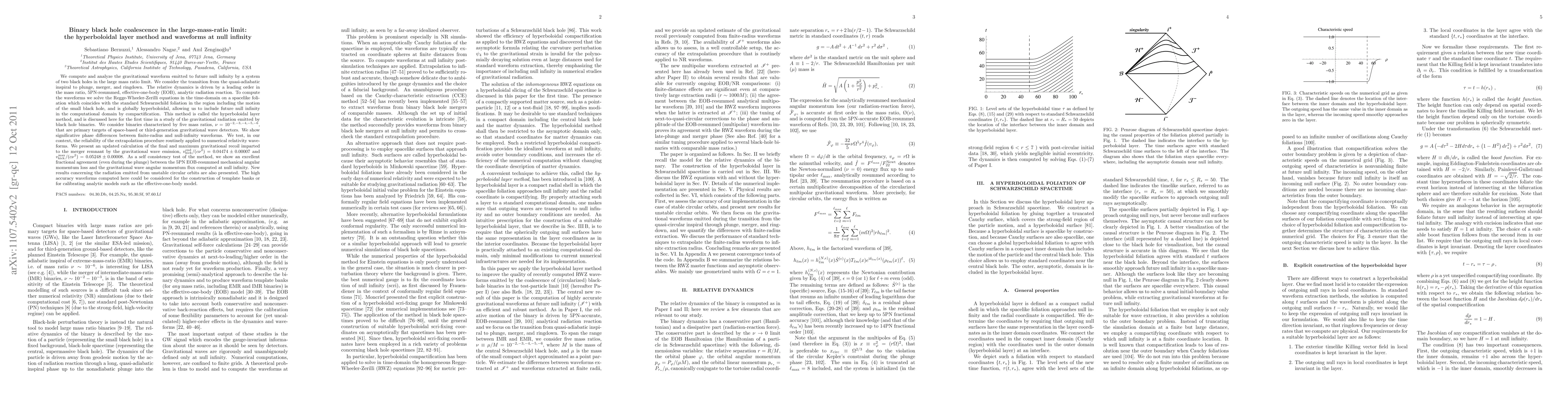 This paper investigates gravitational waveforms from binary black hole coalescence in the large mass-ratio limit using the hyperboloidal layer method. It demonstrates significant phase differences between finite-radius and null-infinity waveforms, validates the extrapolation procedure for numerical relativity waveforms, and presents an updated calculation of gravitational recoil from the merger remnant.