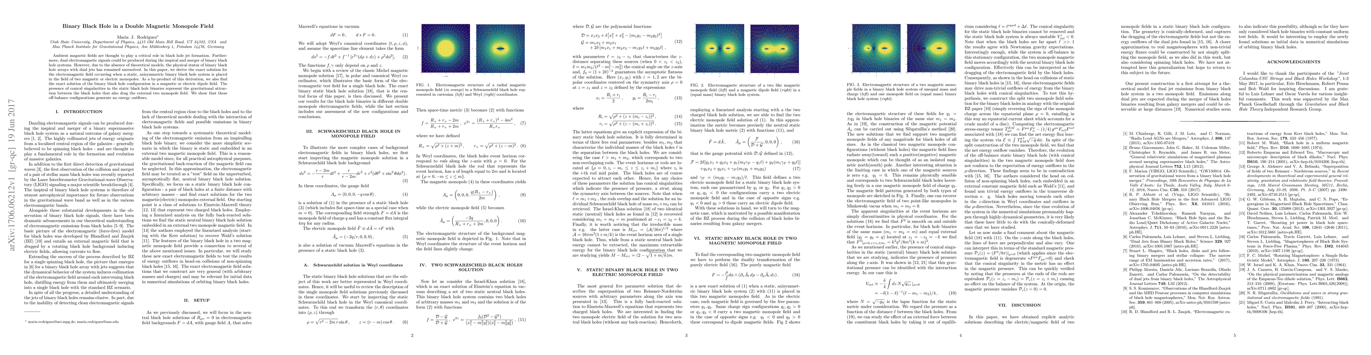 This paper derives the exact electromagnetic field solution for a static, axisymmetric binary black hole system in a double magnetic or electric monopole field, revealing that such configurations generate no energy outflows despite the gravitational attraction between the black holes. Additionally, it finds the exact solution for binary black holes in a dipole field.