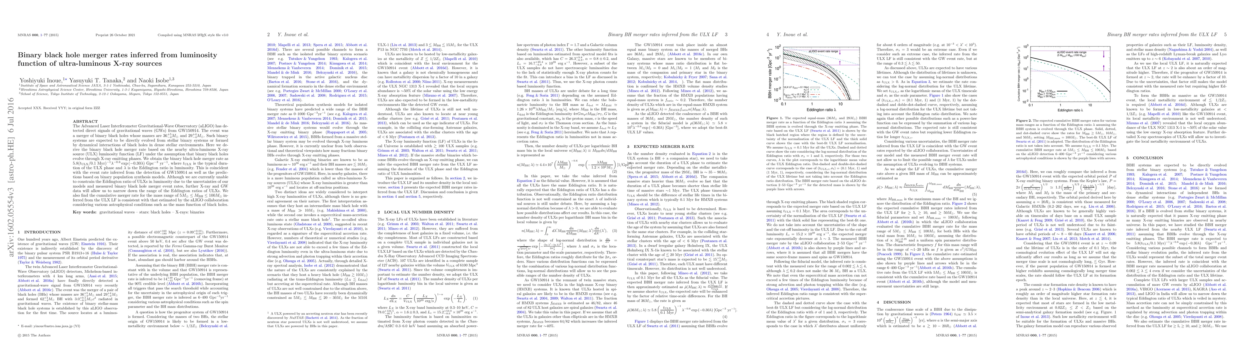 The Advanced Laser Interferometer Gravitational-Wave Observatory (aLIGO) has detected direct signals of gravitational waves (GWs) from GW150914. The event was a merger of binary black holes whose masses are $36^{+5}_{-4}M_{\odot}$ and $29^{+4}_{-4}M_{\odot}$. Such binary systems are expected to be directly evolved from stellar binary systems or formed by dynamical interactions of black holes in dense stellar environments. Here we derive the binary black hole merger rate based on the nearby ultra-luminous X-ray source (ULX) luminosity function (LF) under the assumption that binary black holes evolve through X-ray emitting phases. We obtain the binary black hole merger rate as $5.8 ({t}_{\rm ULX}/{0.1 \ \rm Myr})^{-1} \lambda^{-0.6} \exp{(-0.30\lambda)} \ {\rm Gpc^{-3}\ yr^{-1}}$, where $t_{\rm ULX}$ is the typical duration of the ULX phase and $\lambda$ is the Eddington ratio in luminosity. This is coincident with the event rate inferred from the detection of GW150914 as well as the predictions based on binary population synthesis models. Although we are currently unable to constrain the Eddington ratio of ULXs in luminosity due to the uncertainties of our models and measured binary black hole merger event rates, further X-ray and GW data will allow us to narrow down the range of the Eddington ratios of ULXs. We also find the cumulative merger rate for the mass range of $5M_\odot\le M_{\rm BH}\le100M_\odot$ inferred from the ULX LF is consistent with that estimated by the aLIGO collaboration considering various astrophysical conditions such as the mass function of black holes.
