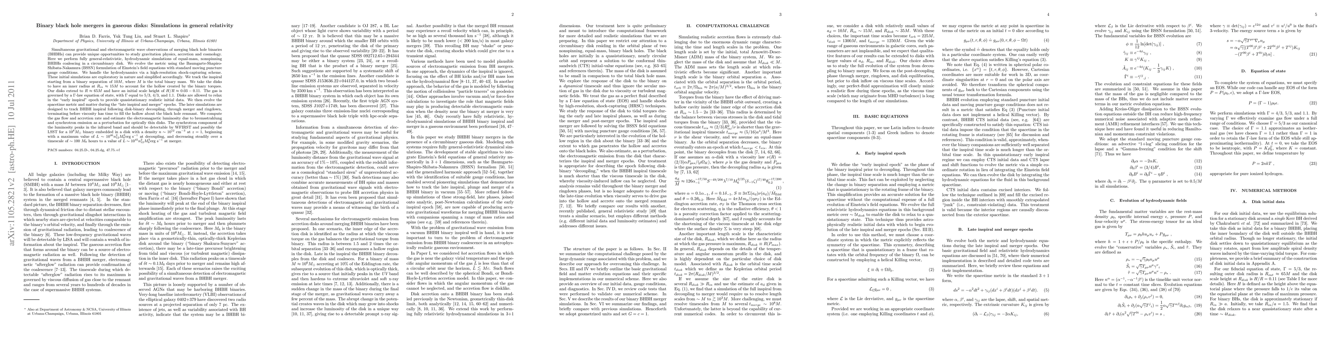 Simultaneous gravitational and electromagnetic wave observations of merging black hole binaries (BHBHs) can provide unique opportunities to study gravitation physics, accretion and cosmology. Here we perform fully general relativistic, hydrodynamic simulations of equal-mass, nonspinning BHBHs coalescing in a circumbinary disk. We evolve the metric using the Baumgarte-Shapiro-Shibata-Nakamura (BSSN) formulation of Einstein's field equations with standard moving puncture gauge conditions. We handle the hydrodynamics via a high-resolution shock-capturing (HRSC) scheme. We track the inspiral starting from a binary separation of 10M, where M is the total binary mass. We take the disks to have an inner radius at R_in~15M to account for the hollow created by the binary torques. Our disks extend to R=65M and have an initial scale height of H/R=0.03-0.11. The gas is governed by a Gamma-law EOS, with Gamma equal to 5/3, 4/3, and 1.1. Disks are allowed to relax in the "early inspiral" epoch to provide quasistationary realistic initial data. We then evolve the metric and matter during the "late inspiral and merger" epoch. The later simulations are designed to track BHBH inspiral following disk-binary decoupling, through merger and ringdown, terminating before viscosity has time to fill the hollow about the remnant. We compute the gas flow and accretion rate and estimate the electromagnetic luminosity due to bremsstrahlung and synchrotron emission as a perturbation for optically thin disks. The synchrotron component of the luminosity peaks in the infrared band and should be detectable by WFIRST and possibly the LSST for a 10^8 M_sun binary embedded in a disk with a density n~10^12/cm^3 at z=1, beginning with a maximum value of $L~10^46 n_12^2 M_8^3 erg/s at decoupling, and decreasing steadily over a timescale of ~100 M_8 hours to a value of L~10^45 n_12^2 M_8^3 erg/s at merger.