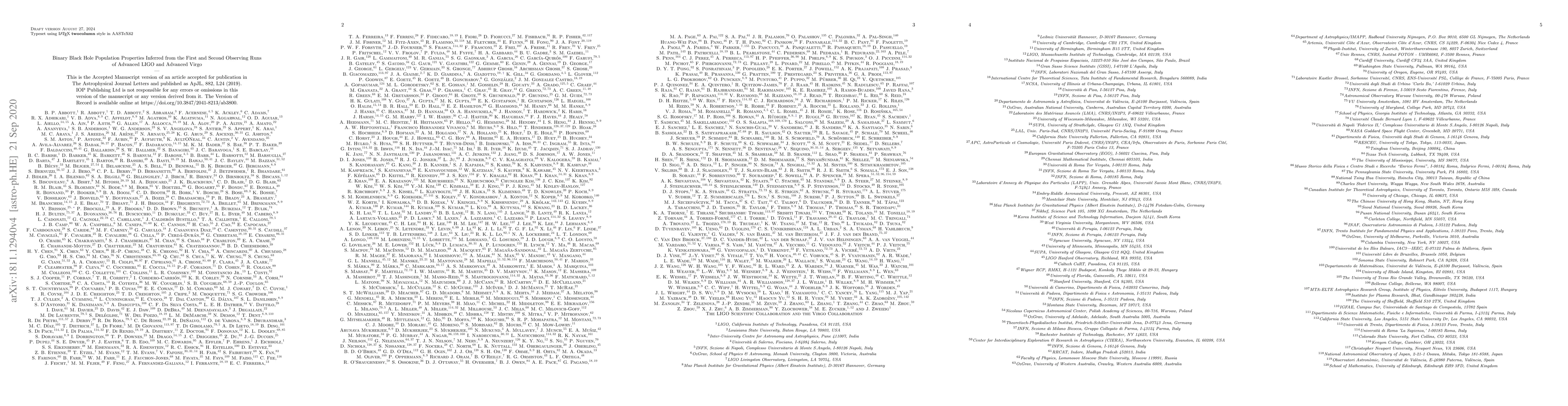 This paper analyzes the mass, spin, and redshift distributions of binary black hole mergers detected by Advanced LIGO and Virgo, finding that the mass distribution peaks at lower masses and that aligned large spins are unlikely. The study estimates a merger rate density of 53.2 Gpc$^{-3}$ yr$^{-1}$, suggesting the merger rate is increasing with redshift.