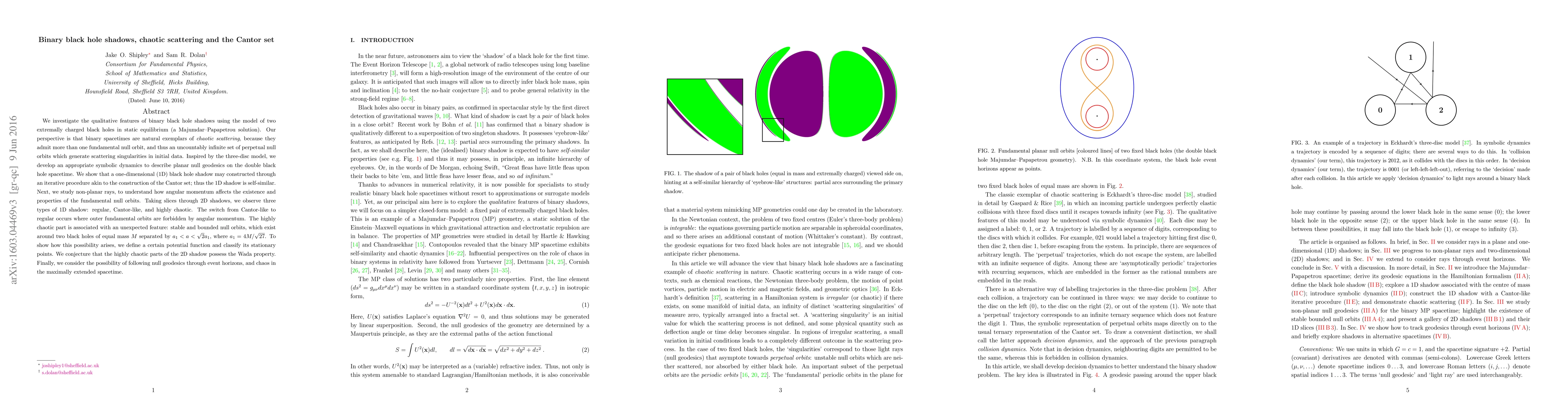 We investigate the qualitative features of binary black hole shadows using the model of two extremally charged black holes in static equilibrium (a Majumdar--Papapetrou solution). Our perspective is that binary spacetimes are natural exemplars of chaotic scattering, because they admit more than one fundamental null orbit, and thus an uncountably-infinite set of perpetual null orbits which generate scattering singularities in initial data. Inspired by the three-disc model, we develop an appropriate symbolic dynamics to describe planar null geodesics on the double black hole spacetime. We show that a one-dimensional (1D) black hole shadow may constructed through an iterative procedure akin to the construction of the Cantor set; thus the 1D shadow is self-similar. Next, we study non-planar rays, to understand how angular momentum affects the existence and properties of the fundamental null orbits. Taking slices through 2D shadows, we observe three types of 1D shadow: regular, Cantor-like, and highly chaotic. The switch from Cantor-like to regular occurs where outer fundamental orbits are forbidden by angular momentum. The highly chaotic part is associated with an unexpected feature: stable and bounded null orbits, which exist around two black holes of equal mass $M$ separated by $a_1 < a < \sqrt{2} a_1$, where $a_1 = 4M/\sqrt{27}$. To show how this possibility arises, we define a certain potential function and classify its stationary points. We conjecture that the highly chaotic parts of the 2D shadow possess the Wada property. Finally, we consider the possibility of following null geodesics through event horizons, and chaos in the maximally-extended spacetime.
