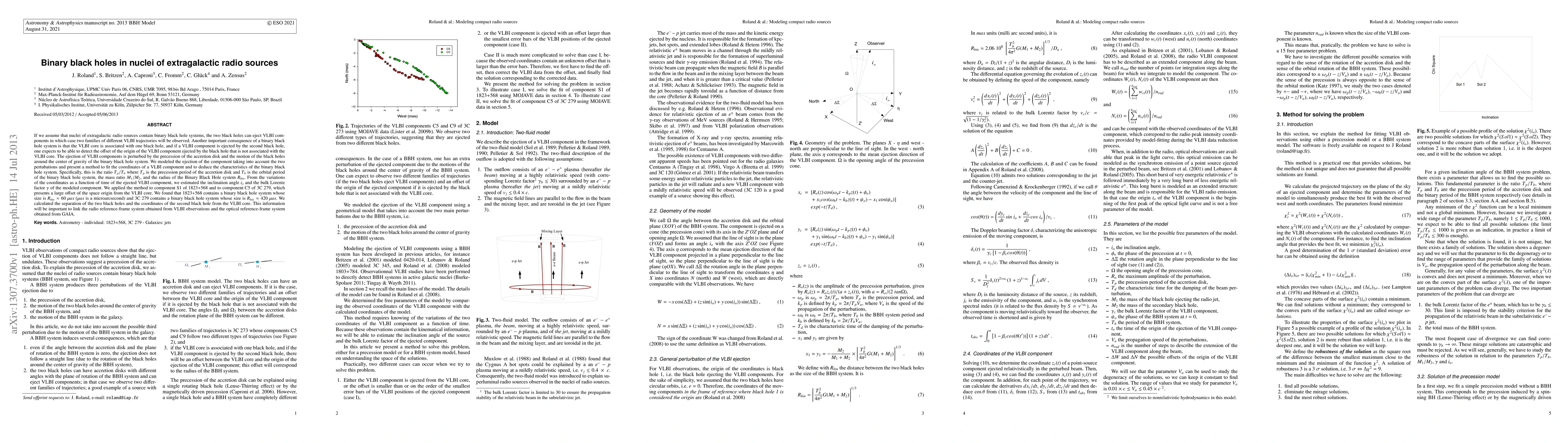 If we assume that nuclei of extragalactic radio sources contain binary black hole systems, the two black holes can eject VLBI components in which case two families of different VLBI trajectories will be observed. Another important consequence of a binary black hole system is that the VLBI core is associated with one black hole, and if a VLBI component is ejected by the second black hole, one expects to be able to detect the offset of the origin of the VLBI component ejected by the black hole that is not associated with the VLBI core. The ejection of VLBI components is perturbed by the precession of the accretion disk and the motion of the black holes around the center of gravity of the binary black hole system. We modeled the ejection of the component taking into account the two pertubations and present a method to fit the coordinates of a VLBI component and to deduce the characteristics of the binary black hole system. Specifically, this is the ratio Tp/Tb where Tp is the precession period of the accretion disk and Tb is the orbital period of the binary black hole system, the mass ratio M1/M2, and the radius of the Binary Black Hole system Rbin. From the variations of the coordinates as a function of time of the ejected VLBI component, we estimated the inclination angle io and the bulk Lorentz factor gamma of the modeled component. We applied the method to component S1 of 1823+568 and to component C5 of 3C 279.
