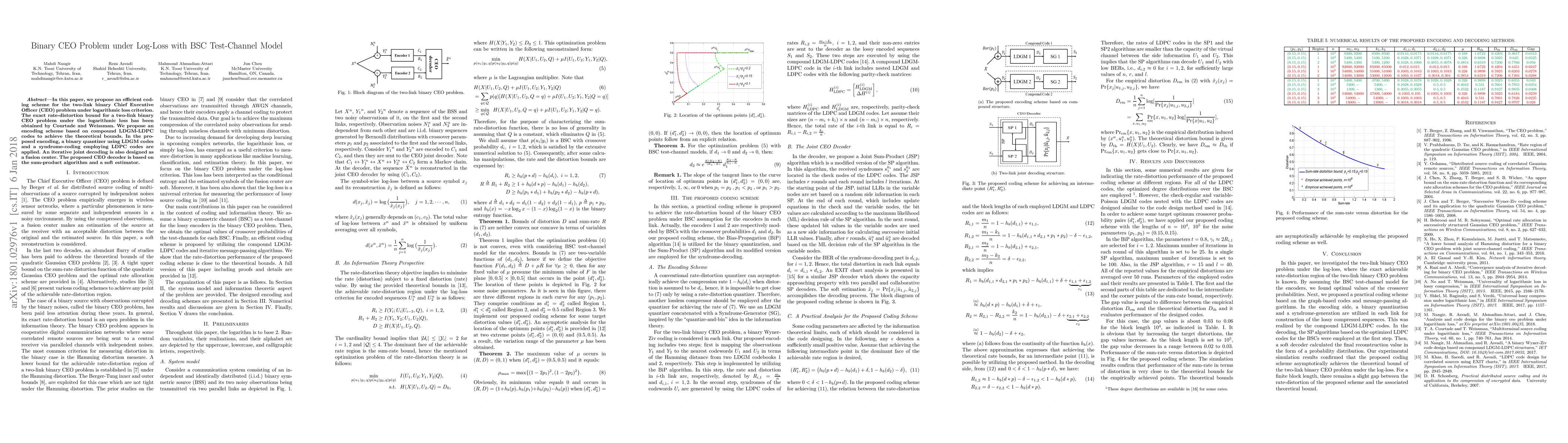 In this paper, we propose an efficient coding scheme for the two-link binary Chief Executive Officer (CEO) problem under logarithmic loss criterion. The exact rate-distortion bound for a two-link binary CEO problem under the logarithmic loss has been obtained by Courtade and Weissman. We propose an encoding scheme based on compound LDGM-LDPC codes to achieve the theoretical bounds. In the proposed encoding, a binary quantizer using LDGM codes and a syndrome-coding employing LDPC codes are applied. An iterative joint decoding is also designed as a fusion center. The proposed CEO decoder is based on the sum-product algorithm and a soft estimator.