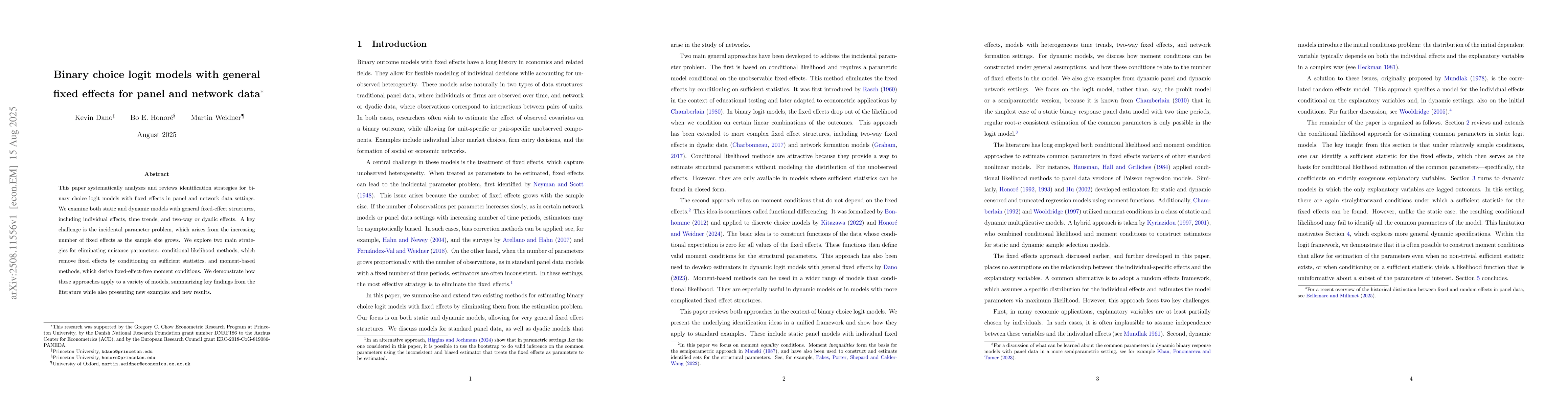 This paper systematically analyzes and reviews identification strategies for binary choice logit models with fixed effects in panel and network data settings. We examine both static and dynamic models with general fixed-effect structures, including individual effects, time trends, and two-way or dyadic effects. A key challenge is the incidental parameter problem, which arises from the increasing number of fixed effects as the sample size grows. We explore two main strategies for eliminating nuisance parameters: conditional likelihood methods, which remove fixed effects by conditioning on sufficient statistics, and moment-based methods, which derive fixed-effect-free moment conditions. We demonstrate how these approaches apply to a variety of models, summarizing key findings from the literature while also presenting new examples and new results.