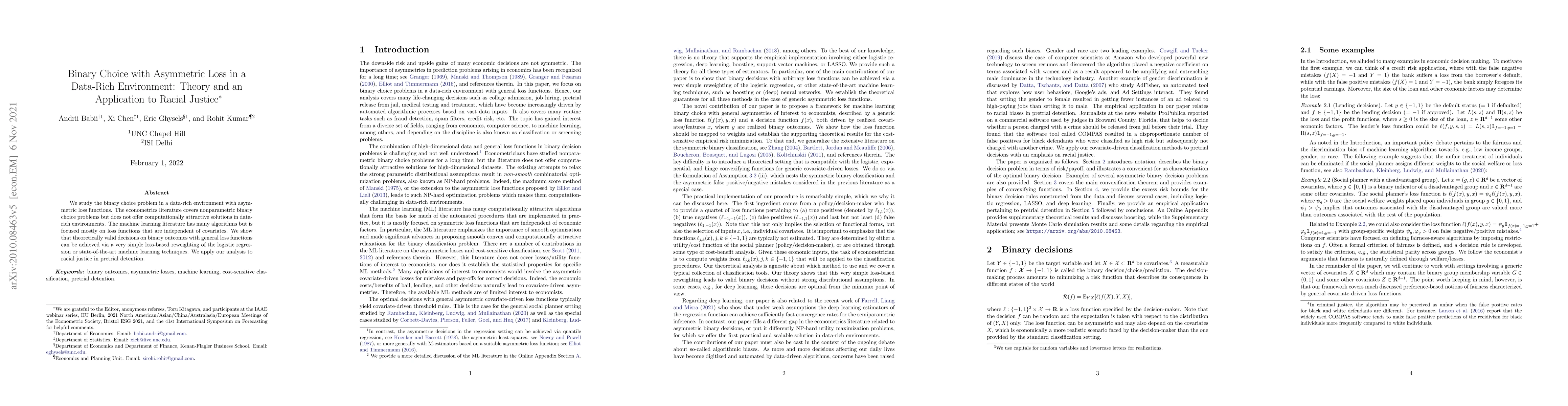 We study the binary choice problem in a data-rich environment with asymmetric loss functions. The econometrics literature covers nonparametric binary choice problems but does not offer computationally attractive solutions in data-rich environments. The machine learning literature has many algorithms but is focused mostly on loss functions that are independent of covariates. We show that theoretically valid decisions on binary outcomes with general loss functions can be achieved via a very simple loss-based reweighting of the logistic regression or state-of-the-art machine learning techniques. We apply our analysis to racial justice in pretrial detention.