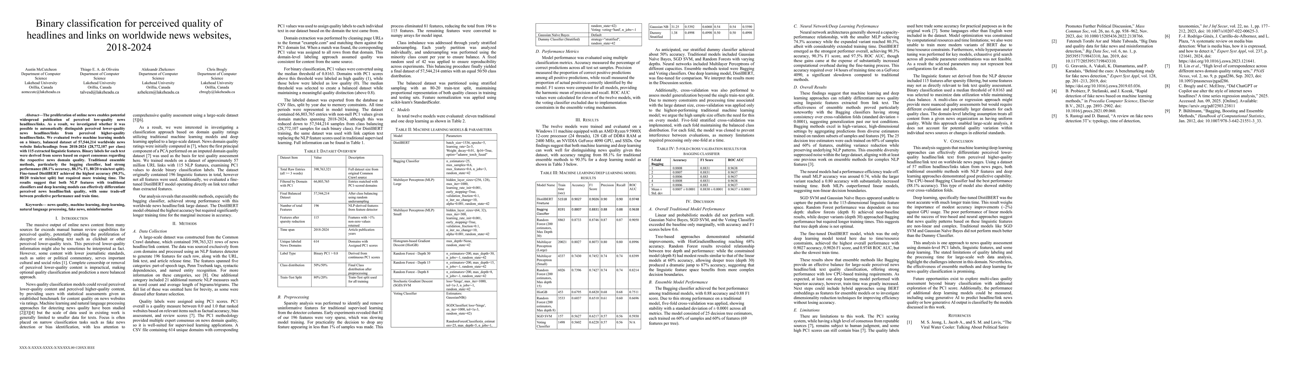 This study used machine learning models to distinguish between high-quality and low-quality news headlines and links on worldwide news websites with high accuracy. The results suggest that traditional classifiers and deep learning models can effectively differentiate perceived quality with varying levels of performance and training time.