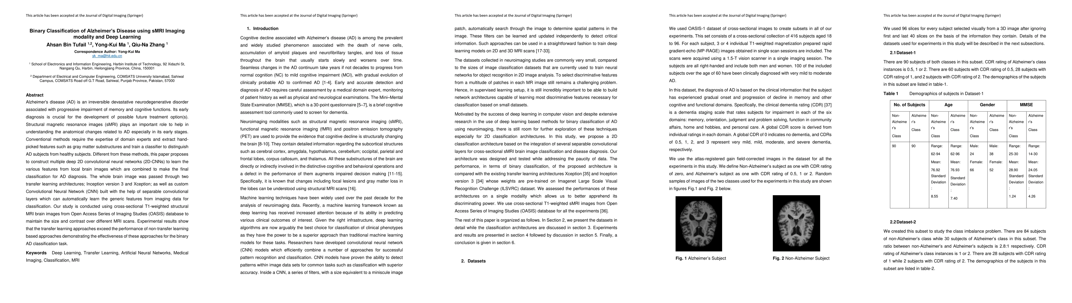 This paper proposes a deep learning approach using 2D convolutional neural networks (2D-CNNs) to classify Alzheimer's disease from structural MRI images. Transfer learning methods like Inception v3, Xception, and custom CNNs outperform conventional feature-based methods, showing improved performance in binary AD classification.