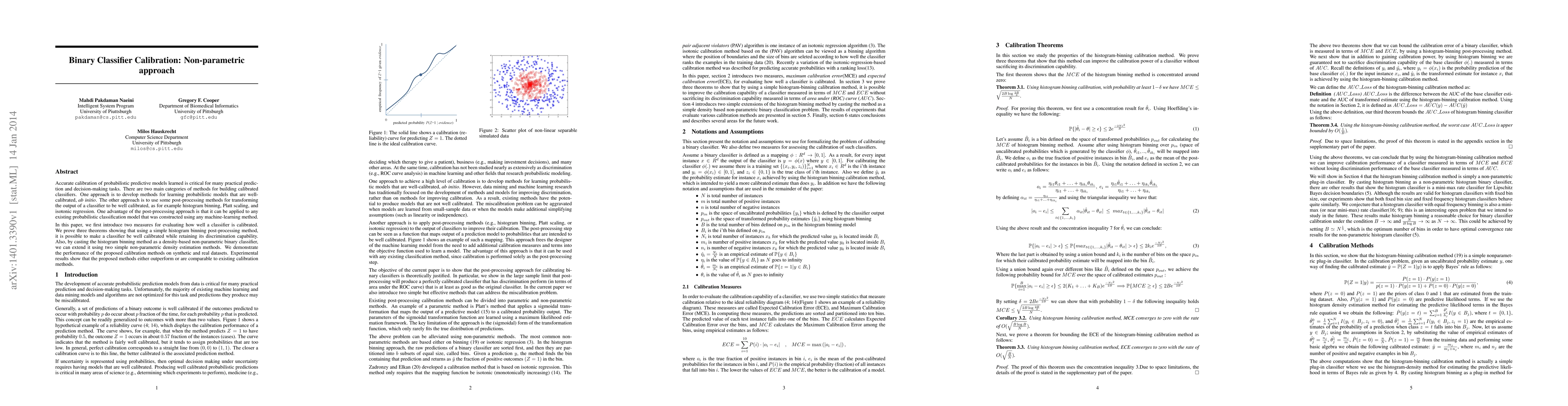 This paper proposes a non-parametric approach for calibrating binary classifiers using histogram binning post-processing. It introduces measures for calibration evaluation and demonstrates that this method retains discrimination while improving calibration, outperforming or matching existing methods in experiments.