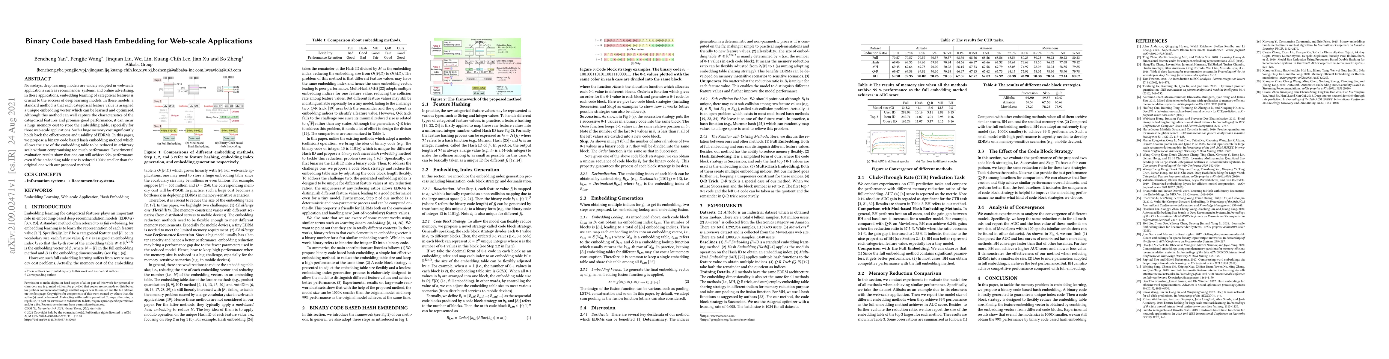A new binary code based hash embedding method reduces memory cost for web-scale applications without compromising performance, allowing for 99% performance even with a 1000x smaller embedding table.