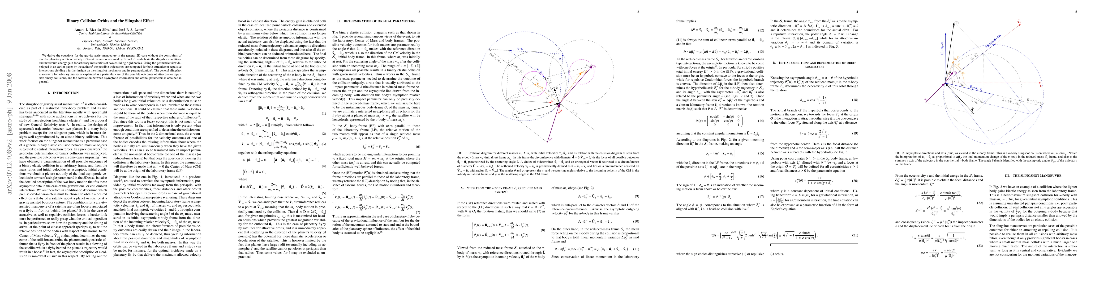 We derive the equations for the gravity assist manoeuvre in the general 2D case without the constraints of circular planetary orbits or widely different masses as assumed by Broucke, and obtain the slingshot conditions and maximum energy gain for arbitrary mass ratios of two colliding rigid bodies. Using the geometric view developed in an earlier paper by the authors the possible trajectories are computed for both attractive or repulsive interactions yielding a further insight on the slingshot mechanics and its parametrization. The general slingshot manoeuvre for arbitrary masses is explained as a particular case of the possible outcomes of attractive or repulsive binary collisions, and the correlation between asymptotic information and orbital parameters is obtained in general.