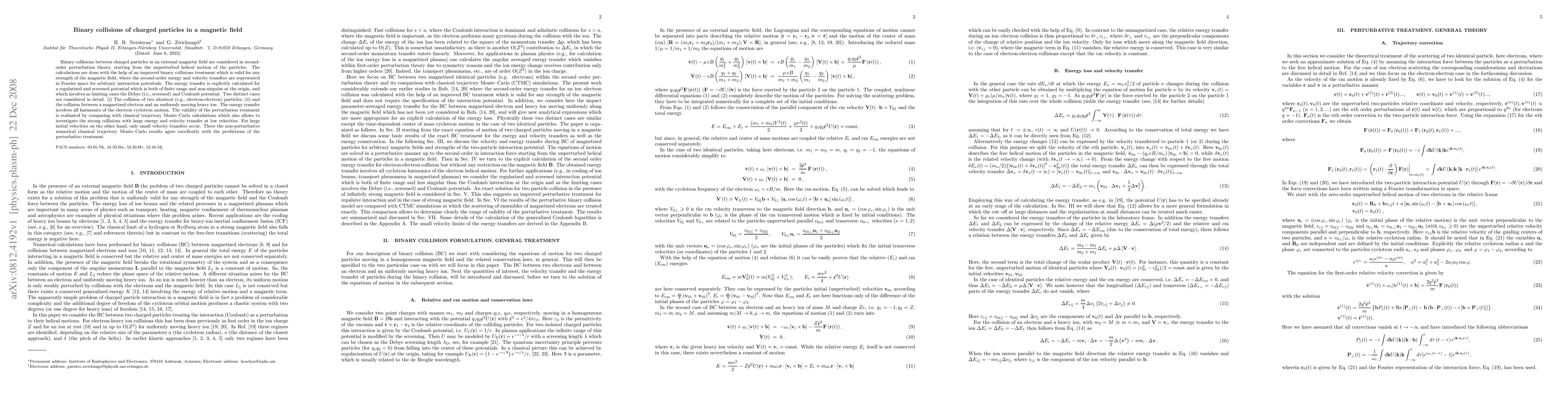 Binary collisions between charged particles in an external magnetic field are considered in second-order perturbation theory, starting from the unperturbed helical motion of the particles. The calculations are done with the help of an improved binary collisions treatment which is valid for any strength of the magnetic field, where the second-order energy and velocity transfers are represented in Fourier space for arbitrary interaction potentials. The energy transfer is explicitly calculated for a regularized and screened potential which is both of finite range and non-singular at the origin, and which involves as limiting cases the Debye (i.e., screened) and Coulomb potential. Two distinct cases are considered in detail. (i) The collision of two identical (e.g., electron-electron) particles; (ii) and the collision between a magnetized electron and an uniformly moving heavy ion. The energy transfer involves all harmonics of the electron cyclotron motion. The validity of the perturbation treatment is evaluated by comparing with classical trajectory Monte--Carlo calculations which also allows to investigate the strong collisions with large energy and velocity transfer at low velocities. For large initial velocities on the other hand, only small velocity transfers occur. There the non-perturbative numerical classical trajectory Monte--Carlo results agree excellently with the predictions of the perturbative treatment.