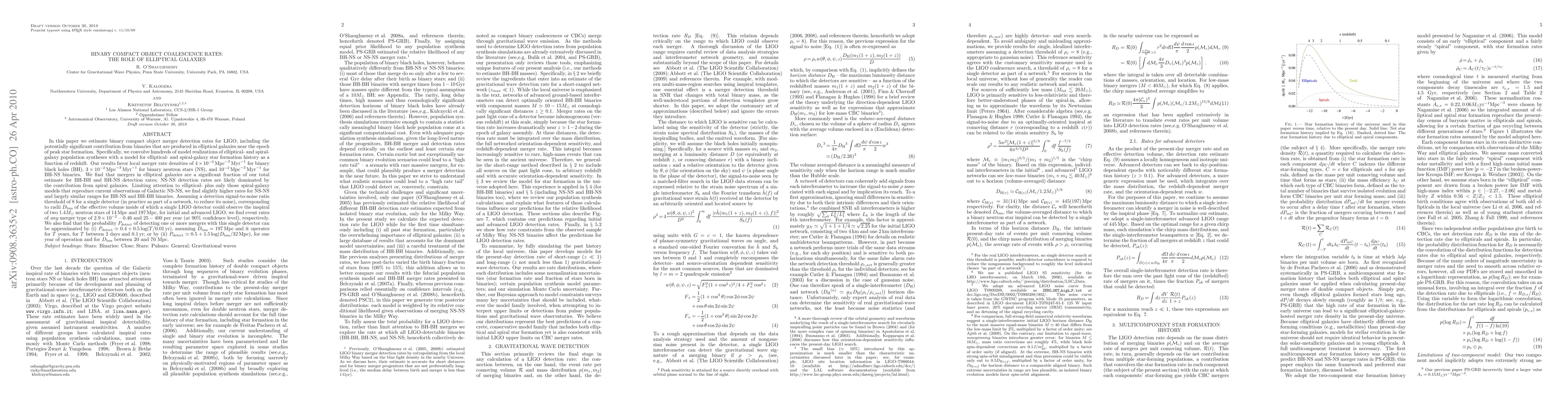 This paper estimates the merger rates of binary compact objects detected by LIGO, emphasizing the contribution from elliptical galaxies. It finds significant merger rates for binary black holes, neutron stars, and mixed binaries, with elliptical galaxies playing a crucial role in black hole mergers. The study projects detection rates for current and advanced LIGO, providing probabilistic models for detecting one or more mergers.