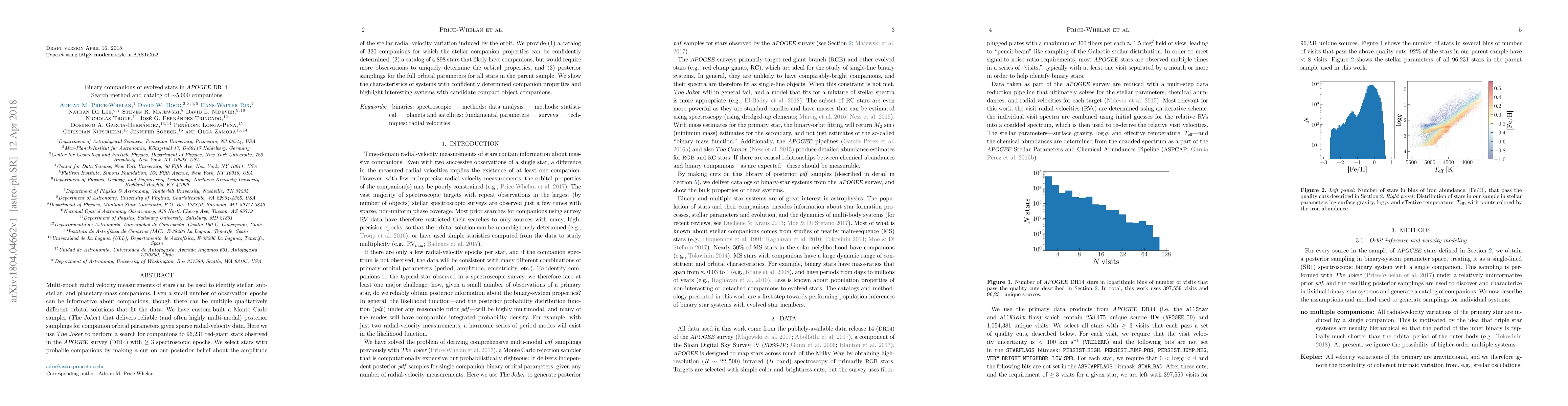 This paper presents a search for binary companions of evolved stars using the APOGEE DR14 survey, employing a custom Monte Carlo sampler called The Joker. It identifies 320 confirmed companions and 4,898 likely companions among 96,231 red-giant stars, highlighting systems with interesting candidates for compact objects.
