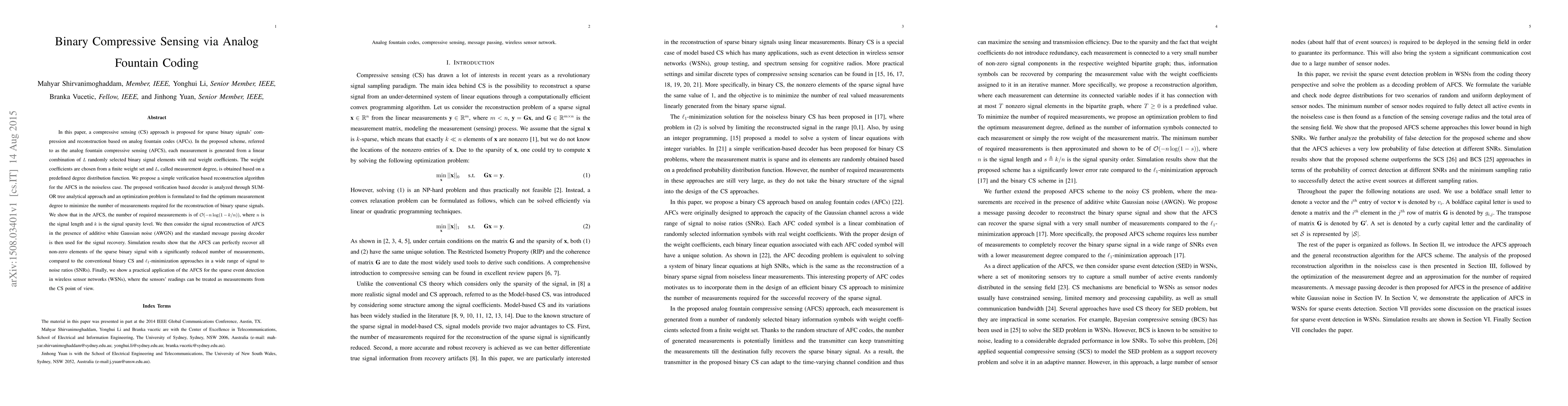 This paper introduces a novel compressive sensing method for binary sparse signals using analog fountain codes. The proposed Analog Fountain Compressive Sensing (AFCS) scheme efficiently compresses and reconstructs binary signals via linear combinations with real weight coefficients. The study shows that AFCS requires fewer measurements (O(-n log(1-k/n))) than conventional methods for reconstruction, particularly in noisy conditions and for sparse event detection in wireless sensor networks.