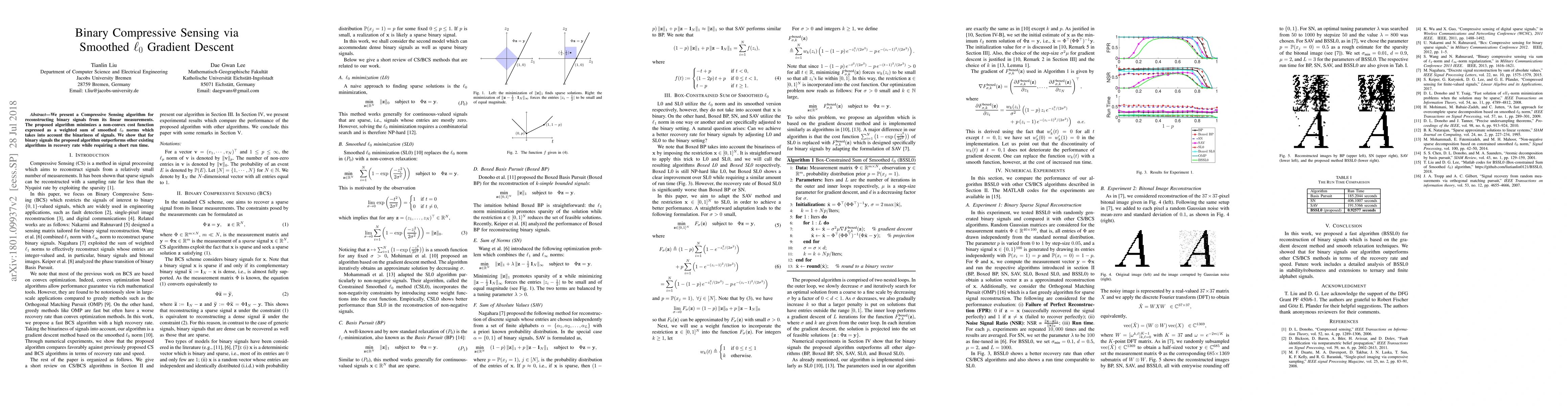 This paper introduces a Compressive Sensing algorithm that reconstructs binary signals using a non-convex cost function based on smoothed $\ell_0$ norms. The proposed method outperforms existing algorithms in recovery rate and has a short run time.