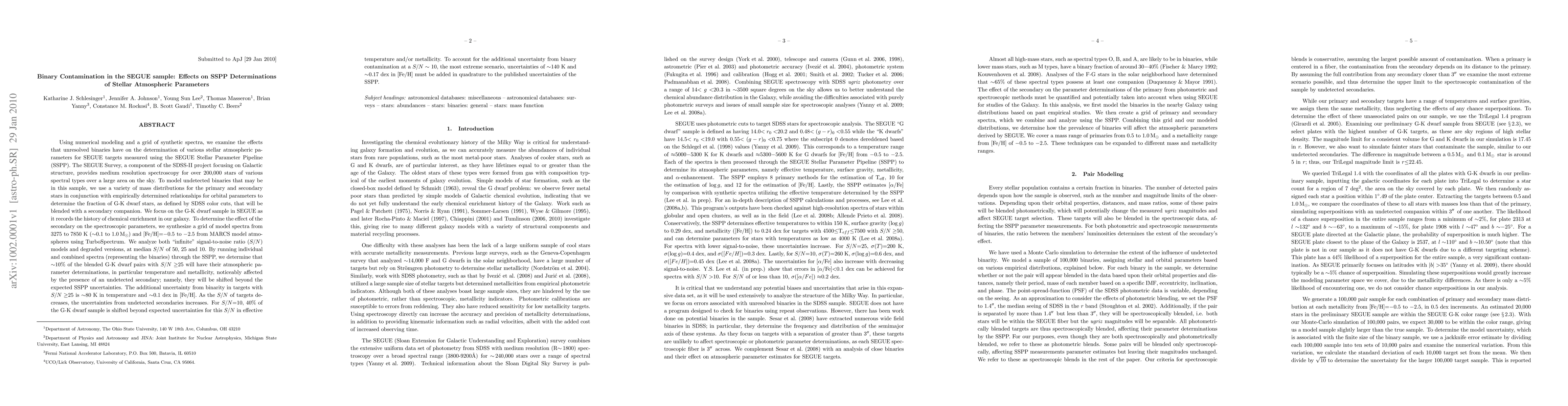 Using numerical modeling and a grid of synthetic spectra, we examine the effects that unresolved binaries have on the determination of various stellar atmospheric parameters for SEGUE targets measured using the SEGUE Stellar Parameter Pipeline (SSPP). To model undetected binaries that may be in the SEGUE sample, we use a variety of mass distributions for the primary and secondary stars in conjunction with empirically determined relationships for orbital parameters to determine the fraction of G-K dwarf stars, as defined by SDSS color cuts, that will be blended with a secondary companion. We focus on the G-K dwarf sample in SEGUE as it records the history of chemical enrichment in our galaxy. To determine the effect of the secondary on the spectroscopic parameters, we synthesize a grid of model spectra from 3275 to 7850 K (~0.1 to 1.0 \msun) and [Fe/H]=-0.5 to -2.5 from MARCS model atmospheres using TurboSpectrum. We analyze both "infinite" signal-to-noise ratio (S/N) models and degraded versions, at median S/N of 50, 25 and 10. By running individual and combined spectra (representing the binaries) through the SSPP, we determine that ~10% of the blended G-K dwarf pairs with S/N>=25 will have their atmospheric parameter determinations, in particular temperature and metallicity, noticeably affected by the presence of an undetected secondary. To account for the additional uncertainty from binary contamination at a S/N~10, uncertainties of ~140 K and ~0.17 dex in [Fe/H] must be added in quadrature to the published uncertainties of the SSPP. (Abridged)
