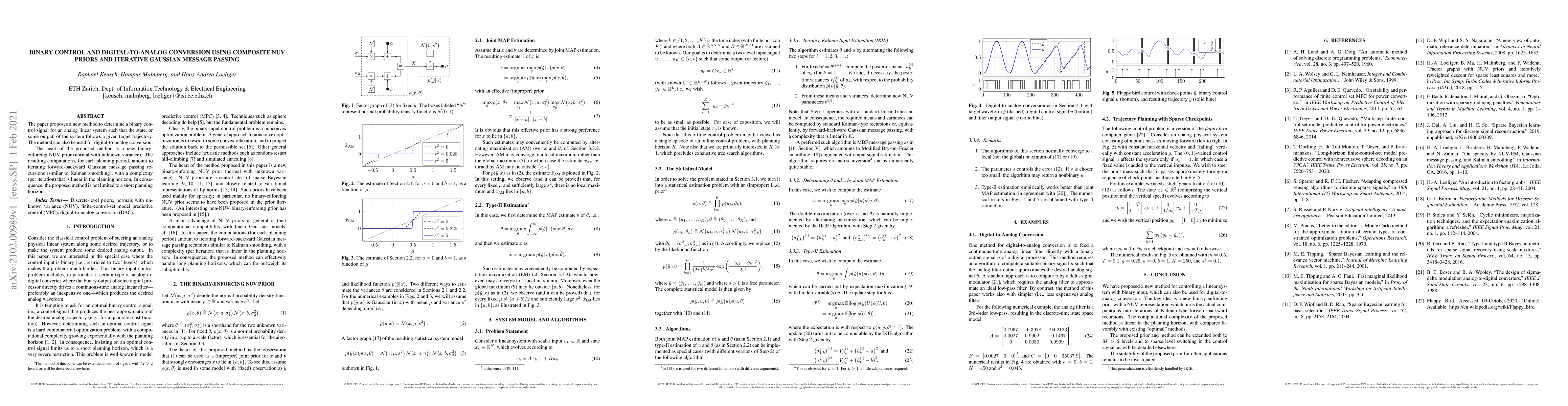 This research introduces a novel method for generating a binary control signal for analog systems to track desired trajectories, applicable also for digital-to-analog conversion. The technique utilizes a binary-enforcing NUV prior and iterative Gaussian message passing, offering linear complexity per iteration, thus enabling long planning horizons without increased computational burden.