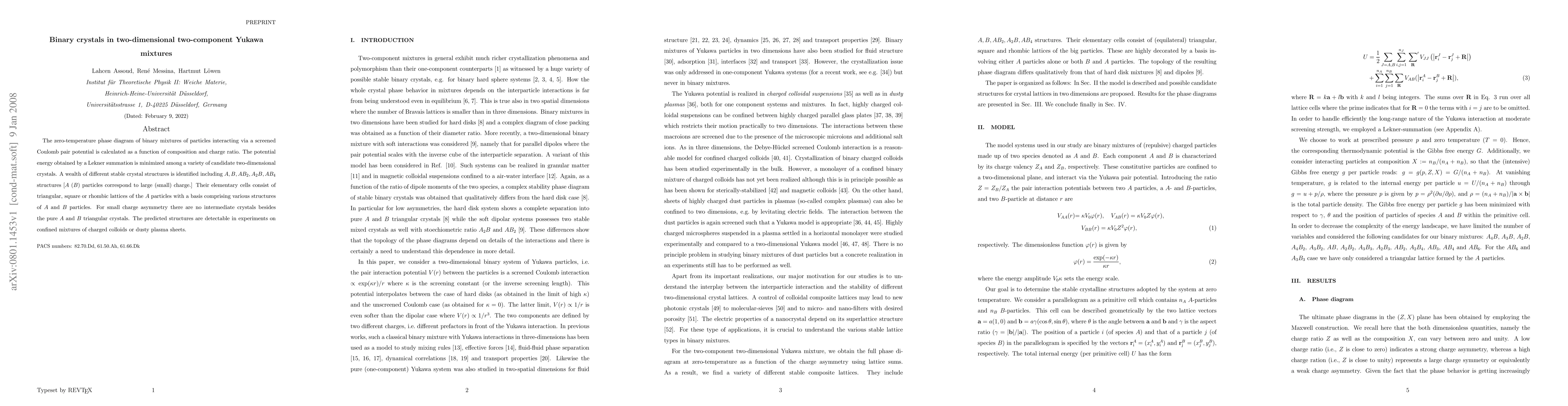 This study investigates the zero-temperature phase diagram of binary mixtures with screened Coulomb interactions, revealing diverse stable crystal structures including $A, B, AB_2, A_2B,$ and $AB_4$ configurations. The analysis identifies various lattice types and shows that for small charge asymmetry, only pure $A$ and $B$ triangular crystals exist without intermediate structures.