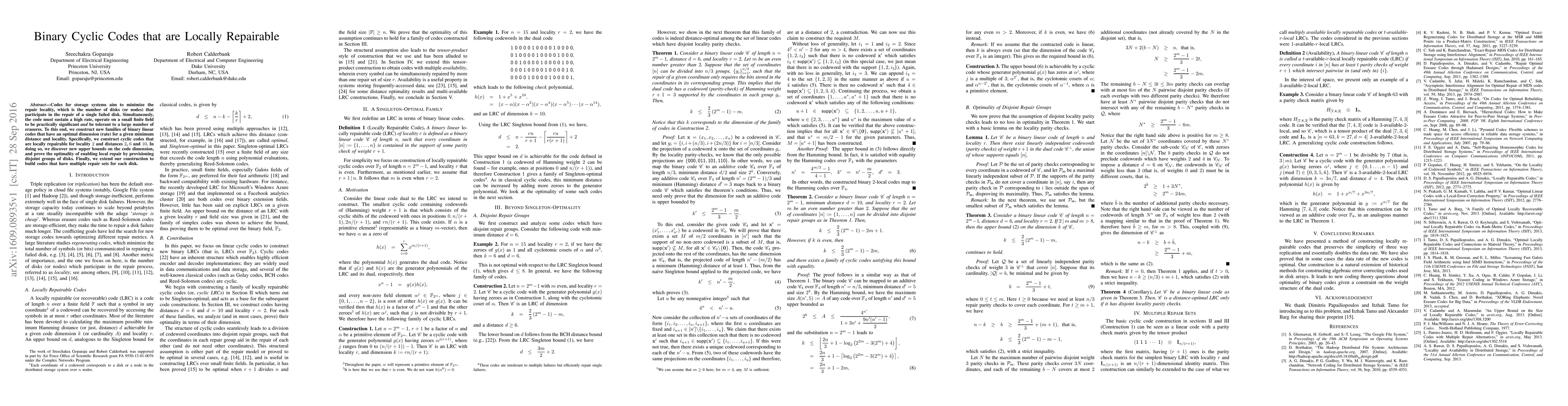 This paper constructs binary cyclic codes for storage systems that optimally balance repair locality and code rate. It presents new families of linear codes for locality 2 and distances 2, 6, and 10, establishing upper bounds on code dimension and proving the effectiveness of disjoint disk groups for local repair. The research also extends to codes with multiple repair sets per disk.