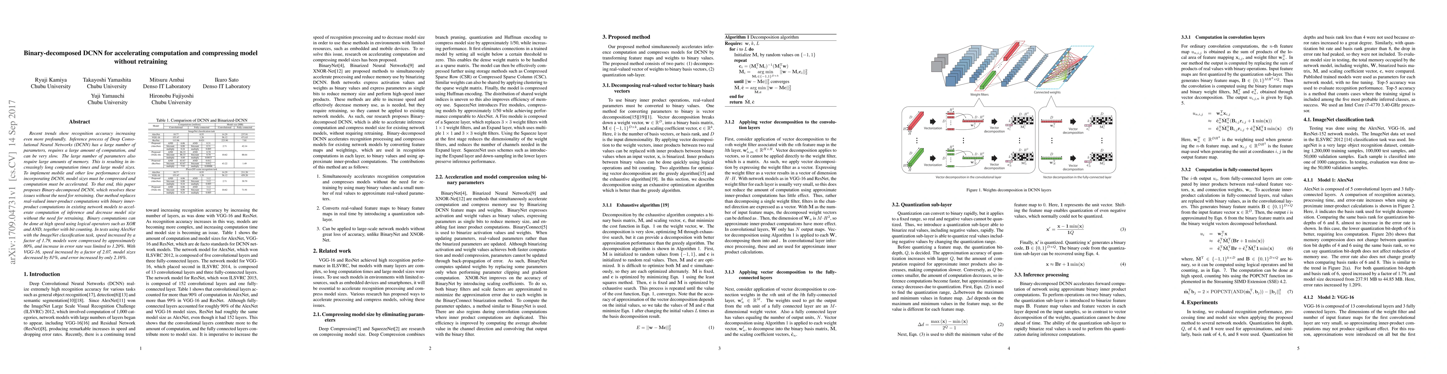A new method called Binary-decomposed DCNN accelerates computation and compresses models of deep convolutional neural networks without retraining, with significant speed increases and model size reductions.