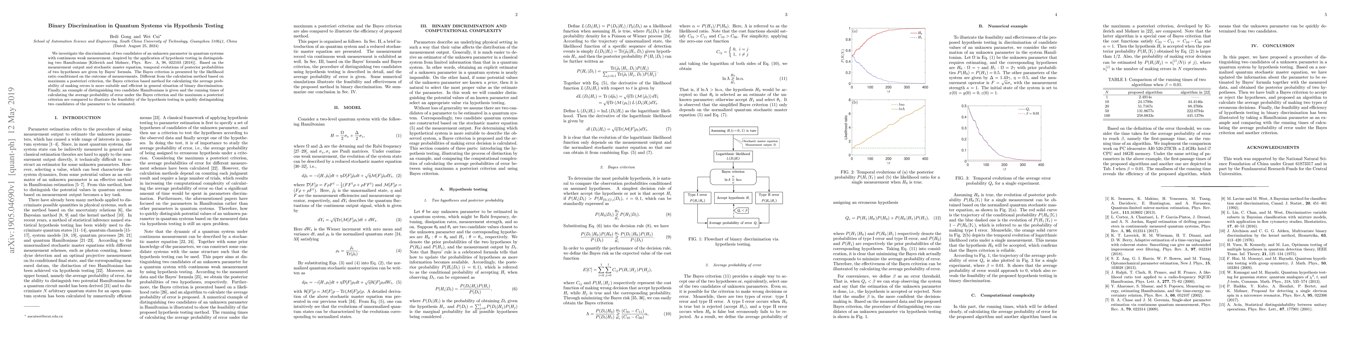 This paper explores the discrimination of two unknown parameter candidates in quantum systems using continuous weak measurement and hypothesis testing. It proposes the Bayes criterion as a more efficient method for calculating the average probability of errors compared to the maximum a posteriori criterion, illustrated by an example of distinguishing two Hamiltonians.