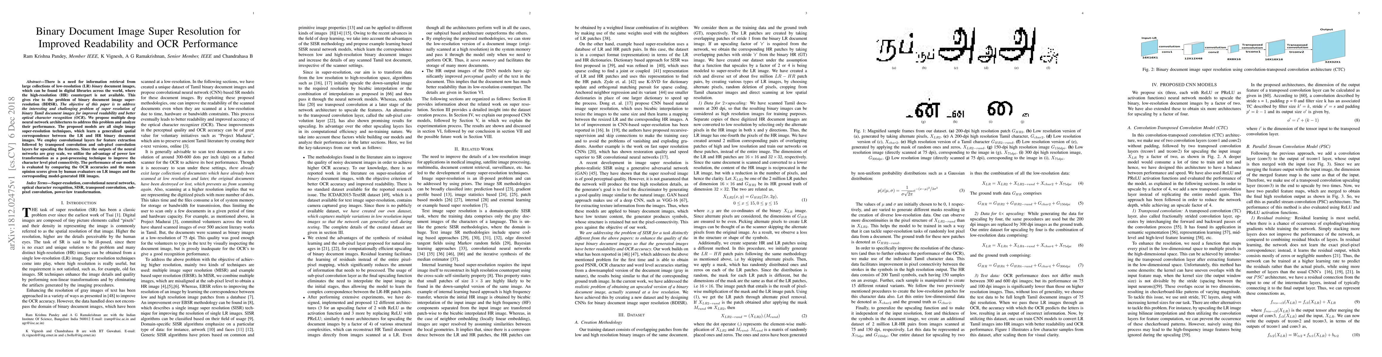 This paper proposes deep neural network architectures for super-resolving low-resolution binary Tamil document images to enhance readability and OCR performance. The models utilize convolutional layers for feature extraction and transposed convolution for upscaling, followed by power law transformation for improved pixel connectivity.